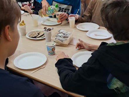 3 października 2024 r., na godzinie wychowawczej, dziewczynki z klasy 6b przygotowały dla chłopaków dodatkową niespodziankę. Zorganizowały poczęstunek, same upiekły ciasta, babeczki oraz deser z jabłkami. Ponadto, przygotowały soki, wodę, kubeczki i talerzyki. Chłopcy bardzo się ucieszyli, a ponieważ klasa była już w kinie, nie spodziewali się, że znów ich coś miłego spotka.