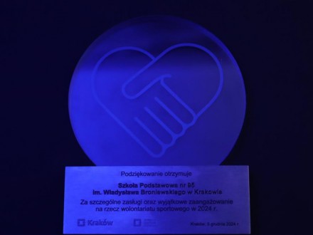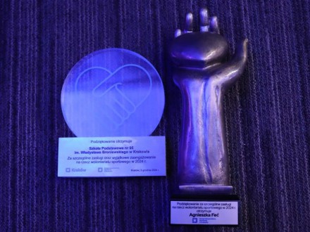 Specjalne wyróżnienie otrzymała również nasza placówka oraz opiekun Szkolnego Klubu Wolontariatu pani Agnieszka Feć, za szczególne zasługi oraz wyjątkowe zaangażowanie na rzecz wolontariatu sportowego w 2024 roku. Nasi uczniowie-wolontariusze pracowali przy organizacji imprez Królewskiej Triady Biegowej: 21 Cracovia Maratonie, 17 PKO Biegu Trzech Kopców oraz 10 Cracovia Półmaratonie Królewskim i Czanieckiej Piątce.