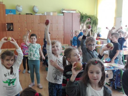 28 września obchodzony jest Światowy Dzień Jabłka. W tym dniu uczniowie z klas I –III uczestniczyli w zajęciach edukacyjnych, których bohaterem było jabłko. Ten najpopularniejszy owoc, to doskonałe źródło witamin i składnik wielu pysznych dań i deserów. W trakcie zajęć dzieci dowiedziały się jakie są korzyści ze spożywania jabłek. Jabłka były tematem rozmów, prac plastycznych i oczywiście nie zabrakło ich w postaci smacznej przekąski. Na zdrowie!