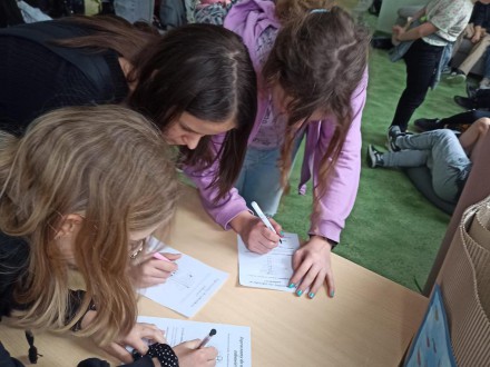 Uczniowie klasy 5e rozdawali ulotki informacyjne o liczbie pi. Na odwrocie ulotek znajdowała się matematyczna krzyżówka - brakowało jednak na niej pytań. Te były ukryte w różnych miejscach w szkole - należało je znaleźć, odgadnąć i wpisać w krzyżówkę, a uzupełnioną wrzucić do urny. Nietypowa zabawa przypadła uczniom do gustu. Spontaniczne pochwały dzieci stanowiły wspaniałą nagrodą za trud włożony w przygotowanie eventu.