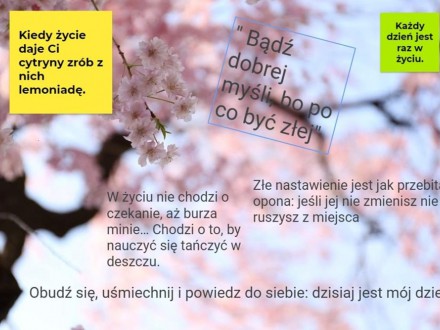 Ogłoszony został szkolny konkurs na plastyczną interpretację dobrych myśli. Zadanie polegało na zilustrowaniu dowolną techniką( malarstwo, rysunek, grafika- także komputerowa, collage, fotografia) pozytywnej myśli. W pracy należało umieścić tekst, który można było wybrać spośród podanych propozycji, zaproponować cytat innego autora lub własną, pozytywną myśl. Spośród nadesłanych prac wyłoniono najciekawsze realizacje. Tworzą one szkolną „Galerię dobrych myśli”.