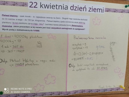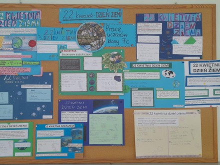 Z okazji Dnia Ziemi klasa 7c, zrealizowała na lekcjach matematyki projekt pt. „22 kwietnia -Dzień Ziemi”. Uczniowie otrzymali zadania tekstowe, ułożone pod tematykę "Ziemia". Zadania dotyczyły powierzchni lądów oraz oceanów, długości równika i południków, naturalnego satelity Ziemi - Księżyca, największych zwierzą żyjących na naszej planecie czy też czasu , w jakim światło dociera z Ziemi w wybranym kierunku. Projekty opatrzono tytułem, pięknymi zdjęciami i rysunkami, dopasowanymi do treści danego zadania. Każdy autor podpisał swoją pracę. Projekty zostały ocenione i umieszczone na gazetce w korytarzu szkolnym na I piętrze