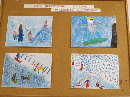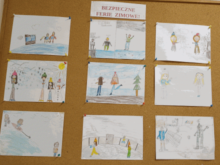 W ostatnich dniach przed zimowym wypoczynkiem wychowawcy przeprowadzili w klasach zajęcia na temat bezpieczeństwa w czasie ferii. Uczniowie oglądali prezentacje, rozwiązywali zagadki, rozmawiali o tym jak bezpiecznie korzystać z zimowych atrakcji. Dzieci z klas 1-3 wykonywały związane z tym tematem prace plastyczne.