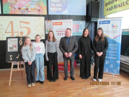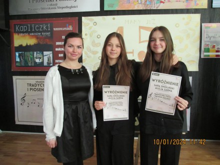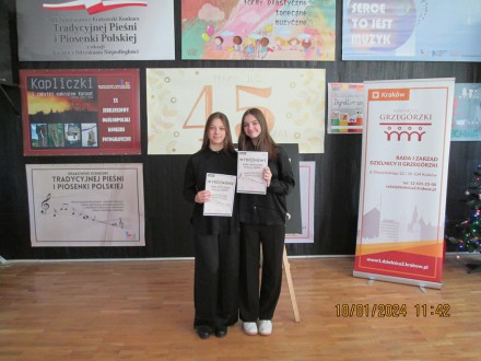 17 listopada 2023 r. odbył się XXI Konkurs Tradycyjnej Pieśni i Piosenki Polskiej w MDK przy ul. Lotniczej 1 w Krakowie. Naszą Szkołę znakomicie reprezentowały Sara Smoliński z kl. 7B oraz Alicja Sarna z kl. 7B, które wykonały w duecie utwór pt. „Jedenasty listopada”.