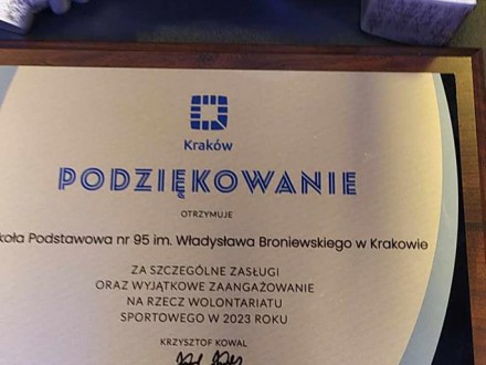 Zaproszeni zostali wolontariusze oraz opiekunowie i nauczyciele ze szkół, które wspierają organizację imprez sportowych w Krakowie. W podziękowaniu za zaangażowanie i bezinteresowność, Dyrektor Zarządu Infrastruktury Sportowej w Krakowie Krzysztof Kowal przekazał na ręce opiekuna Szkolnego Klubu Wolontariatu pani Agnieszki Feć specjalne wyróżnienie i podziękowanie dla naszej Szkoły. Na zakończenie Gali nie zabrakło niespodzianek – spotkania z byłymi reprezentantami Polski w piłce nożnej Sławomirem Peszko i Rafałem Pietrzakiem oraz występu artystycznego showmana Bilguuna Ariunbaatara.