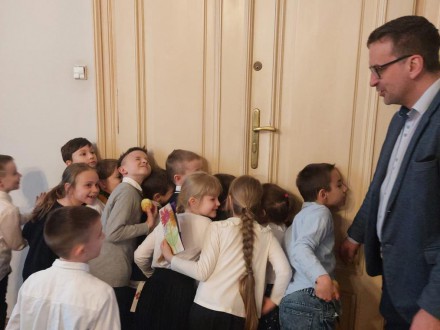 W dniu 06.03.24r.r. uczniowie klasy 1B udali się na wycieczkę do Urzędu Miasta w Krakowie. Wizyta nasza rozpoczęła od spotkania z panem radnym Łukaszem Wantuchem, który oprowadził uczniów po salach Magistratu. Dzieci miały również możliwość obejrzenia na żywo, toczącej się sali obrad, debaty. Była to niepowtarzalna okazja, by przyjrzeć się z bliska miejscu pracy pracownikom Urzędu Miejskiego oraz najważniejszej osobie w mieście. Po krótkiej rozmowie z panem Prezydentem Jackiem Majchrowskim, w ramach podziękowania za miłą wizytę , dzieci przekazały własnoręcznie wykonane laurki oraz zaśpiewały piosenkę pt.” Zimowa poleczka”. Na pożegnanie Pan Prezydent zaprosił dzieci do wspólnego zdjęcia. Zmęczeni, ale pełni entuzjazmu wróciliśmy do szkoły.