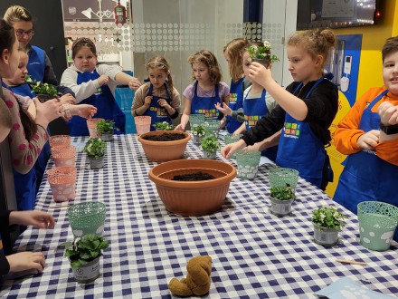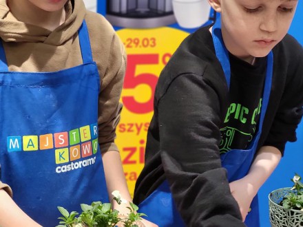 w Castoramie. Na początku oglądali wiosenne kwiaty takie jak tulipany, żonkile, prymulki, bratki, stokrotki i szafirki. Zwracali uwagę na różnorodność kształtów i kolorów. Rozmawiali z panią prowadzącą zajęcia na temat kwiatów oraz tego co jest potrzebne roślinom do życia. Następnie pani pokazała uczniom jak sadzi się kwiaty.