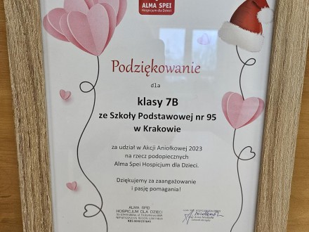 Klasa 7b wzięła udział w Akcji Aniołkowej na rzecz podopiecznych Hospicjum Domowego Alma Spei w Krakowie. Uczniowie przygotowali świąteczną paczkę dla sześcioletniej Zuzi oraz jej rodziny. W świątecznym prezencie znalazły się ciepłe skarpety, kawa, herbata oraz słodycze. Uczniowie klasy 7b bardzo lubią pomagać, dlatego z pewnością nie jest to ostatnia niespodzianka przygotowana przez nich.
