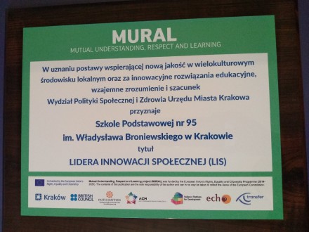 Wiąże się on z udziałem Szkoły w projekcie MURAL - Mutual Understanding, Respect and Learning (Wzajemne zrozumienie, szacunek oraz uczenie się).