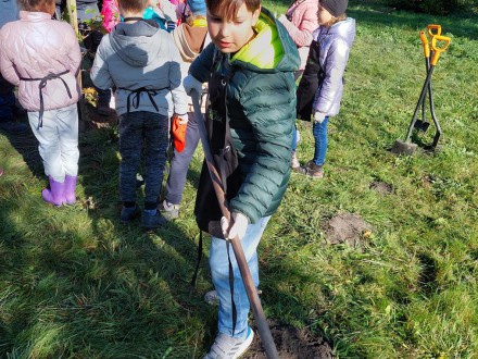 20.10.br., w ramach projektu” Małopolska dla klimatu”, uczniowie klasy 3c brali udział w sadzeniu drzew w szkolnym ogrodzie. Przed rozpoczęciem sadzenia pracownicy pokazali wszystkim dzieciom , jak właściwie należy posadzić drzewko, aby miało największe szanse na przyjęcie i dalszy wzrost. Następnie rozpoczęto sadzenie. Dzieci posadziły sadzonki dębu, graba, klonu, buka. Z wielkim zaangażowaniem wkopywały rośliny, palikowały oraz podlewały. Posadzonym drzewom nadano również imiona :Grażyna, Krystyna, Janusz, Kazimierz, Jurek oraz zawieszono pamiątkowe tabliczki. Zajęcia były pełne emocji. Zakończyły się śpiewem i tańcem wokół drzew. Był to bardzo wyjątkowy dzień dla uczniów.