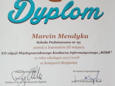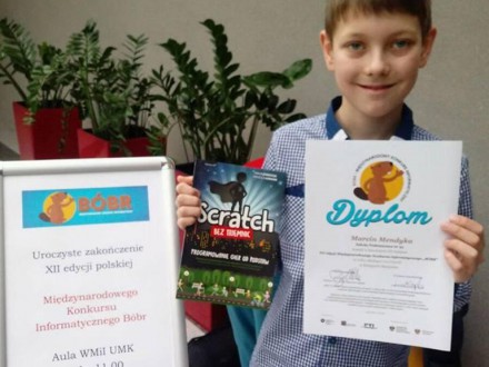 W dniu 16 marca br. w auli Wydziału Informatyki i Mechaniki Uniwersytetu Mikołaja Kopernika w Toruniu odbyło się uroczyste zakończenie XII edycji Międzynarodowego Konkursu Informatycznego "BÓBR", połączone z wręczeniem nagród i dyplomów zwycięzcom. W uroczystości wziął udział uczeń klasy 5a Marcin Mendyka.