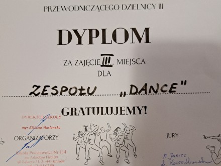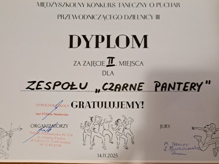W dniu 14.11.2025 r . dwa zespoły naszej szkoły brały udział w Międzyszkolnym Konkursie Tanecznym o Puchar Przewodniczącego Dzielnicy III. Konkurs odbył się w Szkole Podstawowej nr 114. Znakomicie zaprezentowały się nasze uczennice.