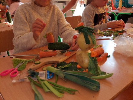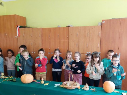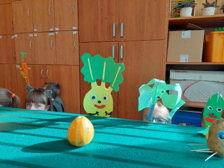 26.10.21r.,w ramach integracji między klasami, uczniowie klasy 2c zaprezentowali kolegom z klasy 1a,1b inscenizację wiersza J .Brzechwy „ Na straganie”. Przygotowane przez dzieci kukiełki i warzywne stworki wzbudziły wśród pierwszaków duże zainteresowanie. Zaśpiewana piosenka „Już owoców pełen kosz” zachęciła wszystkich do spożywania jabłek.