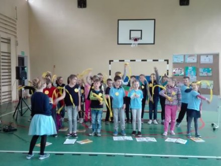Druga część apelu poświęcona była Prawom Dziecka. Uczniowie klas I b i I c, w krótkich wierszykach, przypomnieli jakie prawa mają dzieci, jak je rozumieć i ich przestrzegać. Na koniec wszyscy zgromadzeni zaśpiewali piosenkę, a przedstawiciele klas otrzymali żółte i niebieskie balony do dekoracji sal oraz ilustrowane Prawa Dziecka dla każdego ucznia.