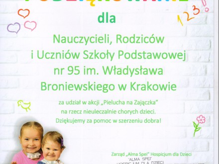 W ramach wspólnie podejmowanych działań mieliśmy okazję uczestniczyć w akcji „Pielucha na Zajączka”, której celem było zorganizowanie zbiórki środków do pielęgnacji niemowląt i małych dzieci oraz pieluszek. Wolontariusze zorganizowali akcję promocyjną na terenie szkoły, podczas której m.in. wykonali własnoręcznie ulotki, plakaty, ozdobili „Pudełko nadziei”, do którego zbierane były dary. Akcja zakończyła się 15 marca 2018 roku. Dary zostały przekazane Hospicjum Dla Dzieci „Alma Spei” i niebawem trafią do dzieci - podopiecznych hospicjum. Nasi wolontariusze będą mieć okazję osobiście poznać rodziny, którym przyszli z pomocą.