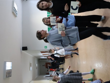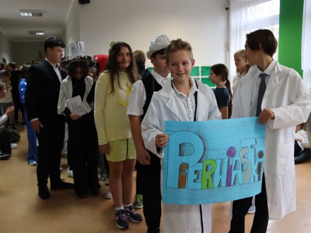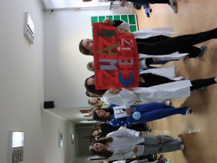 W ramach projektu chemicznego, uczniowie klas siódmych, wykorzystując wiedzę zdobytąna lekcjach, przebrali się za pierwiastki i związki chemiczne. Na długiej przerwie w rytm muzyki przemaszerowali korytarzami szkoły.
