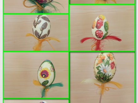 Z dużym zaangażowaniem uczniowie klasy 3b przystąpili do przygotowania wielkanocnych ozdób. Kilka kolejnych zajęć wykonywali pisanki wykorzystując różne techniki zdobienia. Najpierw ozdobili papierowe jajka, do których skręcali kolorowe sznureczki z bibuły. Zadanie wymagało pomysłowości i wielkiej cierpliwości, ale efekt wynagrodził trud wykonania. Na kolejnych zajęciach styropianowe jajka zamieniły się w barwne pisanki za pomocą techniki decoupage . To zadanie wymagało wyobraźni w doborze elementów z różnych serwetek i precyzji w wycinaniu. Wszystkie prace stanowiły piękną dekorację klasowego, świątecznego stołu i zapewne stanowią ozdobę w domach uczniów.