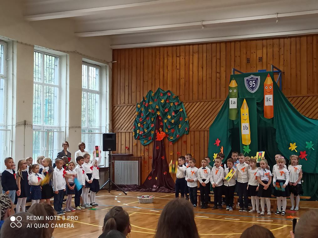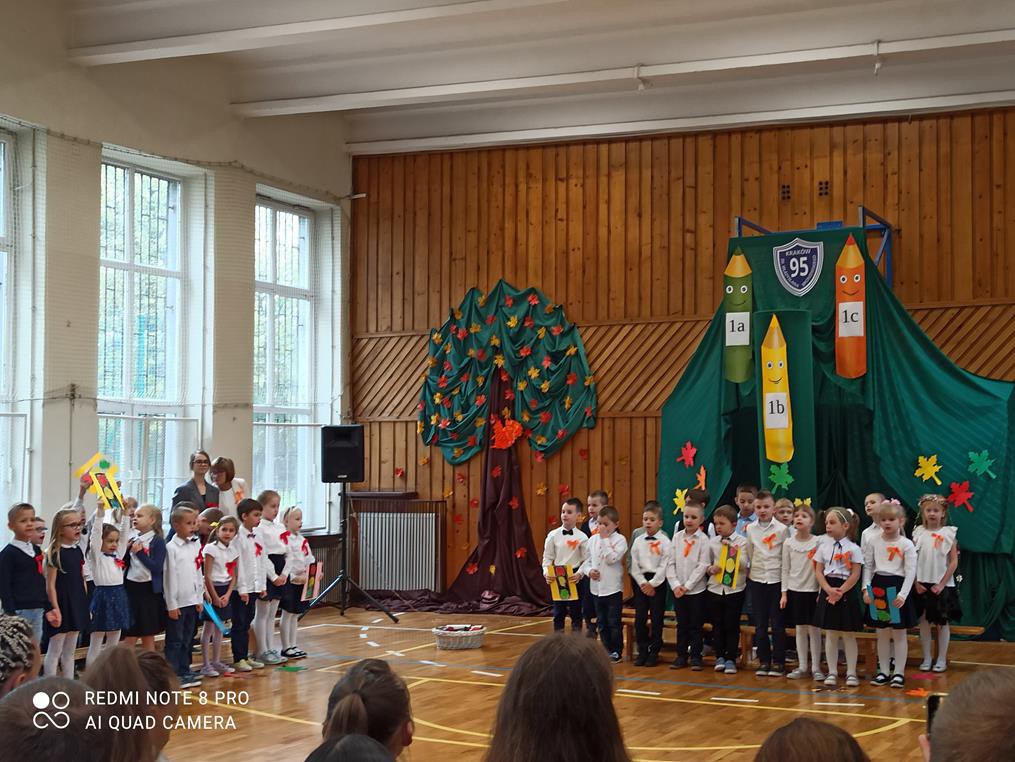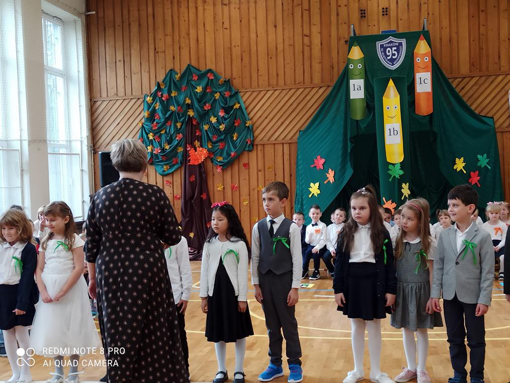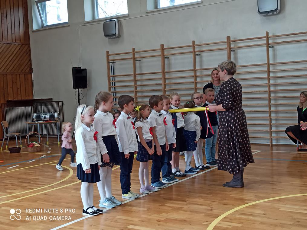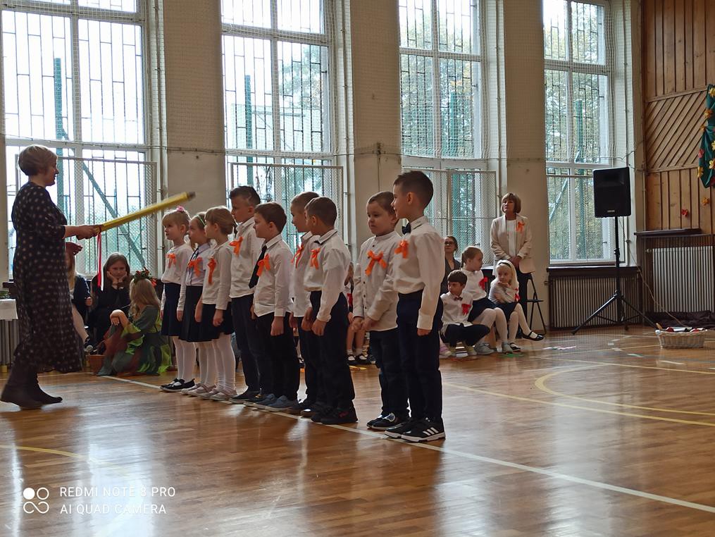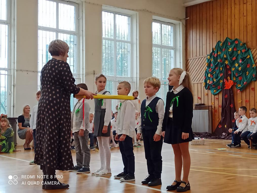Pani dyrektor Anna Hanusiak pogratulowała dzieciom występu, a następnie dokonała uroczystego pasowania na uczniów. Przedstawiciele Samorządu Uczniowskiego poczęstowali pierwszoklasistów jabłkami.