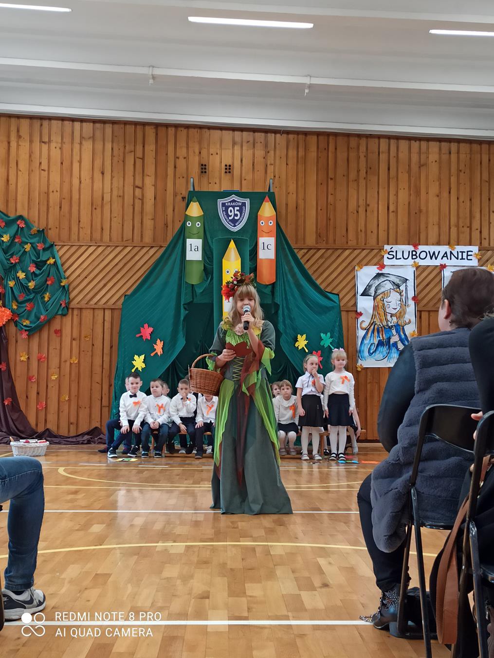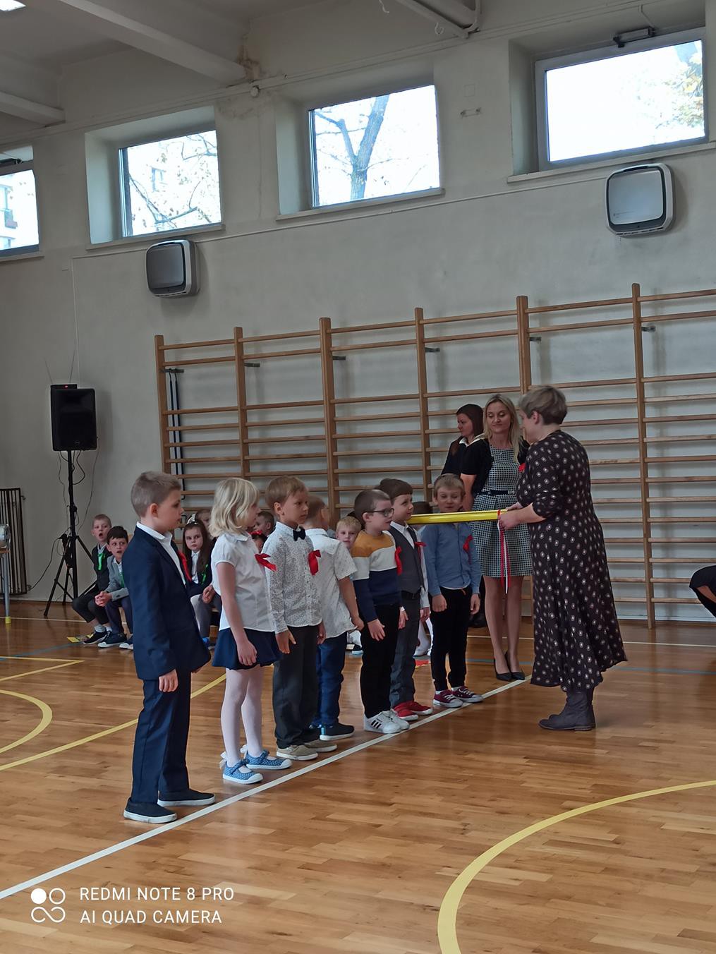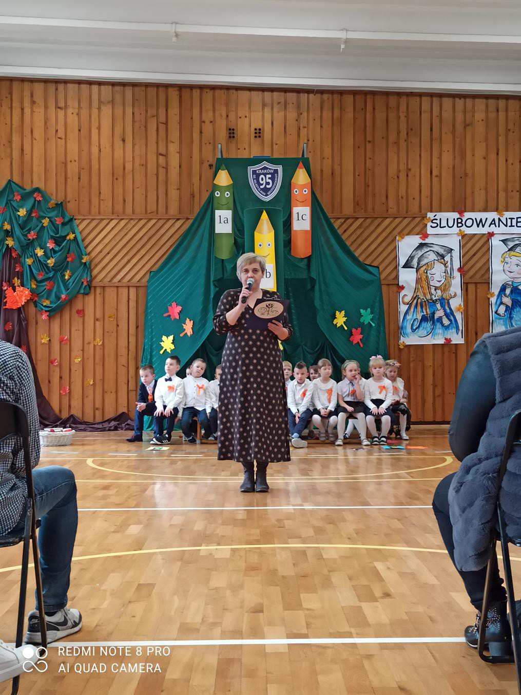 Pani dyrektor Anna Hanusiak pogratulowała dzieciom występu, a następnie dokonała uroczystego pasowania na uczniów. Przedstawiciele Samorządu Uczniowskiego poczęstowali pierwszoklasistów jabłkami.