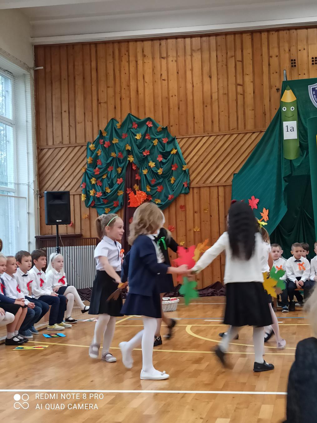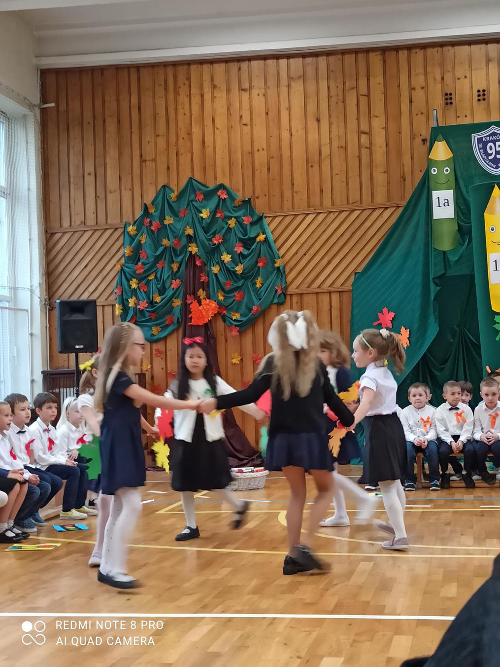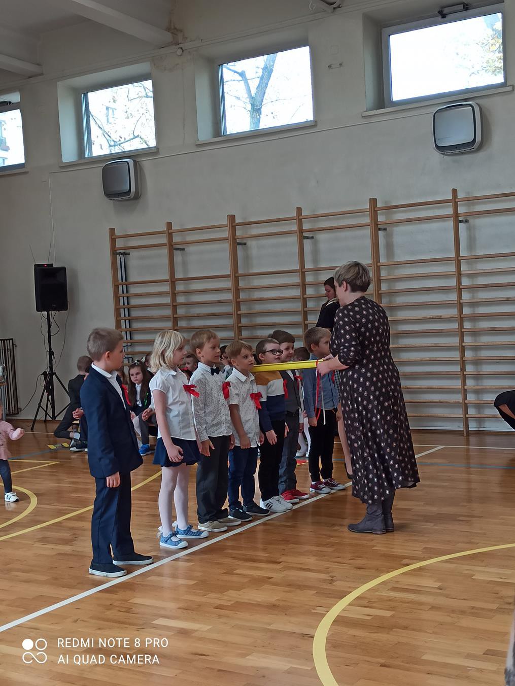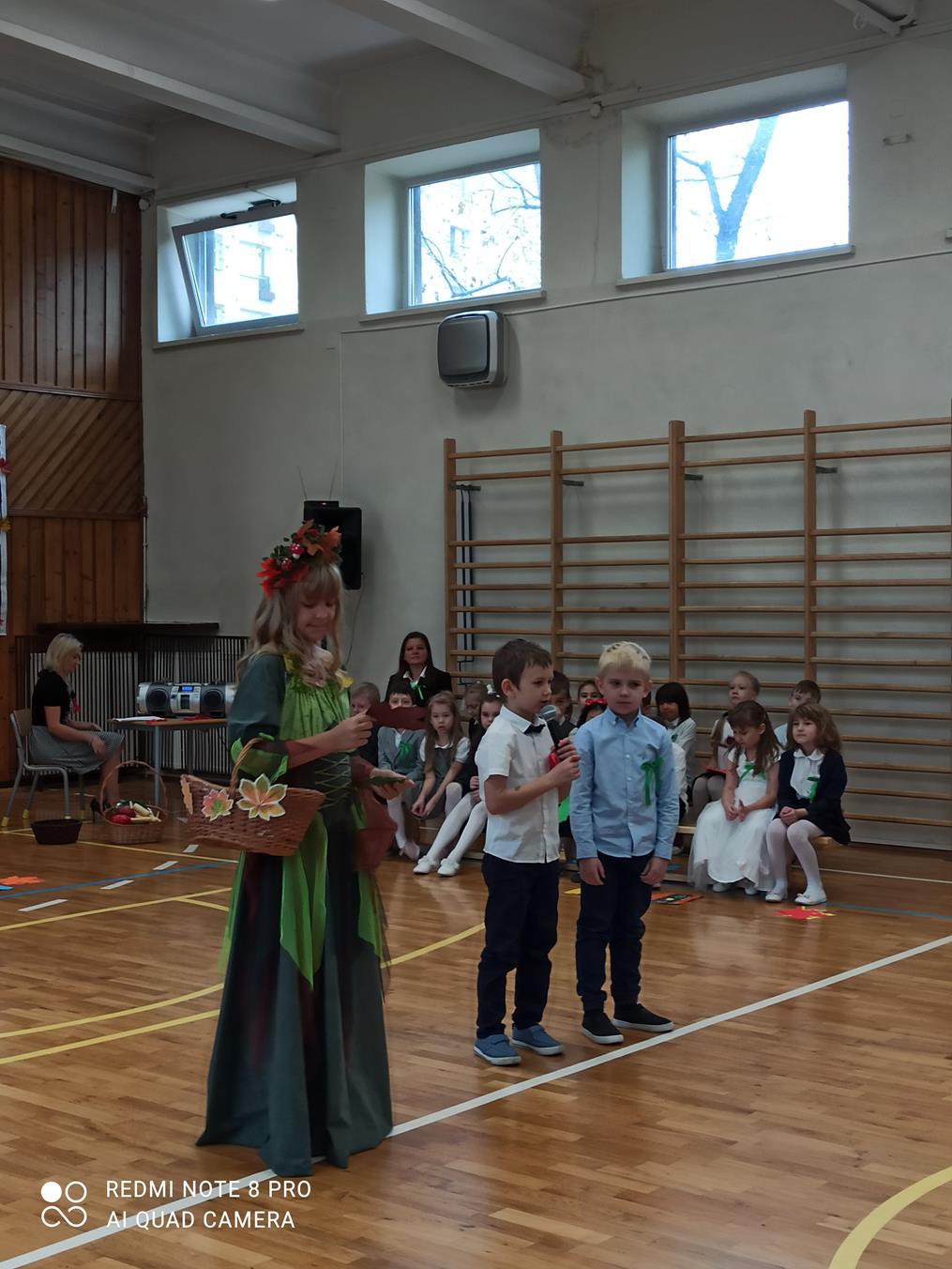 Pani dyrektor Anna Hanusiak pogratulowała dzieciom występu, a następnie dokonała uroczystego pasowania na uczniów. Przedstawiciele Samorządu Uczniowskiego poczęstowali pierwszoklasistów jabłkami.