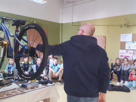 W czwartek 23 listopada w naszej szkole w ramach programu Stars uczniowie klas 7c, 6c oraz 5c odbyli spotkanie z serwisantem rowerowym. Dowiedzieli się jak zbudowany jest rower, jakie są rodzaje jednośladów, jakie jest przeznaczenie poszczególnych modeli. Serwisant udzielał wskazówek dotyczących wymiany dętki, smarowania i konserwacji rowerów. Uczniowie dowiedzieli się również jak należy zabezpieczyć rower przed kradzieżą, jakie oświetlenie zastosować w rowerze, jaki kupić kask i jak poprawnie go zakładać. Na koniec serwisant odpowiadał na pytania uczniów, każdy mógł pooglądać akcesoria rowerowe.