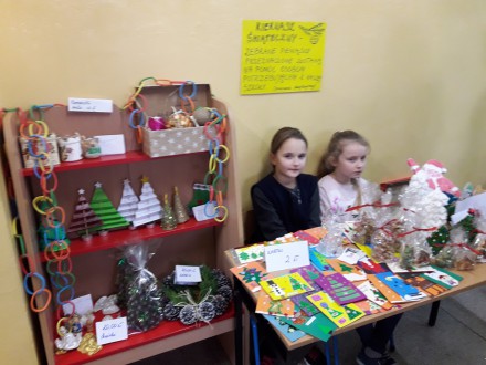 Jak co roku świetlica szkolna zorganizowała Kiermasz Bożonarodzeniowy. Kartki świąteczne, ozdoby, stroiki, wieńce, pierniczki, choinki, aniołki i wiele innych pięknych ozdób świątecznych wykonanych przez uczniów pod opieką nauczycieli cieszyło się ogromnym powodzeniem.