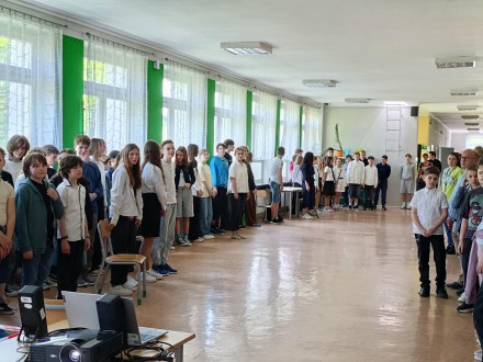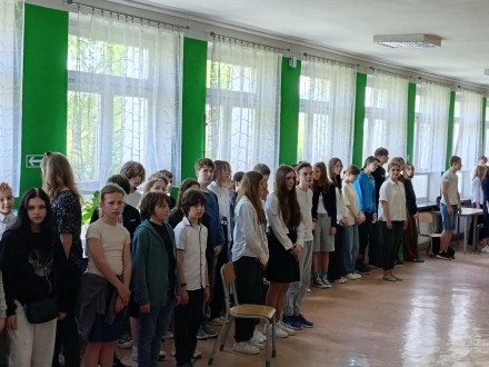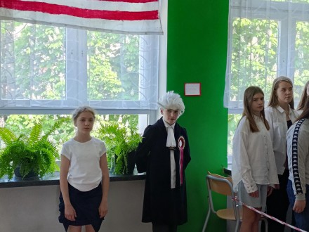 Każdego roku uroczyście świętujemy w szkole rocznicę uchwalenia Konstytucji 3 maja. Nie inaczej było również i tym razem. Uczniowie klas 4c i 5b oraz członkowie koła historycznego, przygotowali krótkie przedstawienie. Miało ono formę relacji telewizyjnej i odbyło się na korytarzach szkolnych. Studio telewizyjne, znajdujące się na parterze, łączyło się kolejno z Warszawą (na I piętrze), gdzie miało miejsce historyczne wydarzenie, oraz z USA (piętro II), aby zasięgnąć opinii z kraju, który jako pierwszy ustanowił konstytucję. Uczniowie, zgromadzeni na wszystkich korytarzach, obserwowali relacje na ekranach. Całe wydarzenie zakończyło się uroczystym odśpiewaniem hymnu przez wszystkich uczniów naszej szkoły.