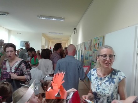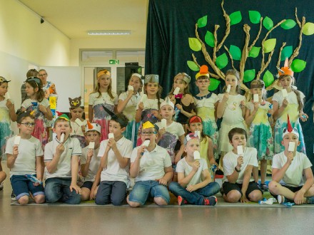 3 czerwca br. uczniowie klasy 2 b zaprezentowali Rodzicom, z okazji Ich święta, inscenizację pt.”Ptasie radio” . Nie był to jednak doskonale znany wszystkim wiersz J. Tuwima, a jego okolicznościowa przeróbka. Kłócące się na wstępie ptaszki, szybko doszły do porozumienia i aby sprawić Rodzicom przyjemność, zgodnie zaprezentowały wiersze, piosenki, tańce oraz złożyły Im życzenia. Rodzice wzięli udział w konkursie zagadek, w którym, na podstawie fragmentów tekstów ułożonych przez dzieci, musieli odgadnąć o kim z nich jest mowa. Ciekawe, oryginalne, a niekiedy zabawne spostrzeżenia dzieci dostarczyły Rodzicom wielu wzruszeń. Autorzy miłych słów w napięciu oczekiwali, czy adresaci prawidłowo rozwiążą zagadki. Na szczęście wszystkie zagadki zostały prawidłowo rozwiązane, a rodzice otrzymali nagrody w postaci pięknych, własnoręcznie przez dzieci wykonanych upominków. Na zakończenie uroczystości czekała na wszystkich aktorów lodowa niespodzianka przygotowana przez rodziców. To było bardzo przyjemne i pełne atrakcji spotkanie.