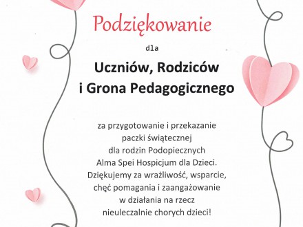 - przeprowadzona została akcja informacyjna o możliwości przekazywania 1,5% podatku na potrzeby Alma Spei Hospicjum dla Dzieci, której odbiorcami byli wszyscy rodzice, nauczyciele i pracownicy szkoły;