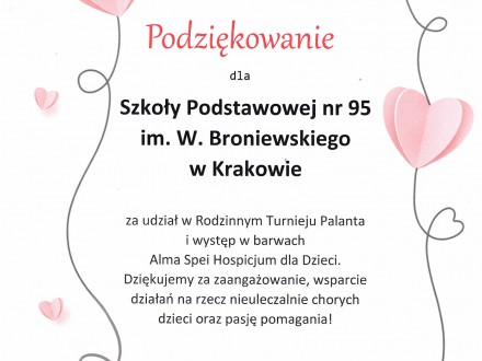 - reprezentacja szkoły wystąpiła w barwach i logo Alma Spei Hospicjum dla Dzieci podczas Rodzinnego Turnieju Palanta w Krakowie. W ten sposób chcieliśmy promować ideę pomagania poza środowiskiem szkolnym oraz zwiększać świadomość innych o istnieniu i działalności Hospicjum.