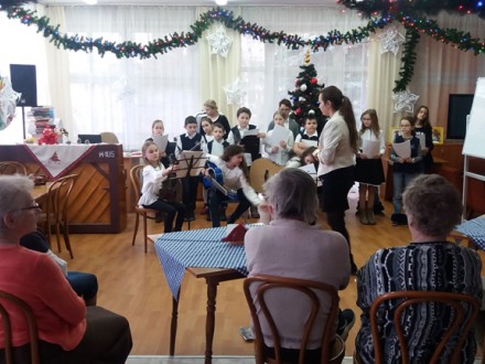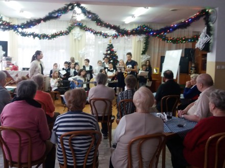 Wizyta połączona była z koncertem muzycznym przygotowanym przez chór szkolny. Odbiór koncertu był fantastyczny! Podziwiano śpiew, grę na skrzypcach, a najbardziej grę na saksofonie. Jedna z pensjonariuszek stwierdziła, "że były tu różne występy, ale saksofonu jeszcze nie było!". Inna pani zainspirowana atmosferą wyrecytowała ułożony przez siebie wiersz. Była to bardzo miła i kształcąca wizyta.