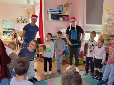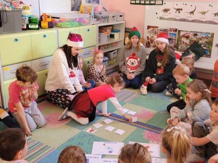 Uczniowie klasy 7b przeprowadzili lekcję języka angielskiego w Samorządowym Przedszkolu nr 66 w Krakowie. Celem projektu była integracja dzieci i młodzieży oraz zainteresowanie przedszkolaków nauką języków obcych. Zajęcia odbywały się w języku angielskim. Uczniowie naszej szkoły przygotowali również liczne rekwizyty i karty obrazkowe, które służyły w przeprowadzeniu gier i zabaw w języku angielskim. Zajęcia bardzo podobały się zarówno dzieciom, jak i młodzieży. Uczniom klasy 7b przyniosły również bardzo dużo satysfakcji z pracy i codziennej nauki języka angielskiego