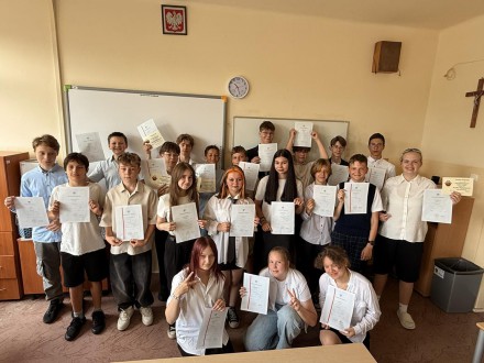 W piątek, 27 czerwca 2025 roku, uczniowie spotkali się z wychowawcami w swoich salach lekcyjnych na uroczystym zakończeniu roku szkolnego. Był to czas podsumowania wspólnych miesięcy nauki, pracy i rozwoju, a także moment refleksji nad osiągnięciami i wyzwaniami mijającego roku.
