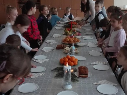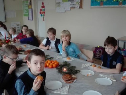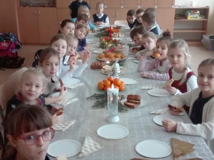 Każdego roku, przed świętami, odbywają się w klasach wigilijne spotkania. 20.12 również uczniowie klasy 2 b przygotowali klasową Wigilię. Najpierw wszyscy uczestniczyli w nakrywaniu i dekorowaniu stołu, na którym znalazły się pyszne ciasta upieczone przez mamy. Potem, łamiąc się opłatkiem, składaliśmy sobie życzenia. Przy stole rozmawialiśmy o świątecznych zwyczajach i rodzinnych tradycjach związanych z Bożym Narodzeniem. Wspólnie śpiewaliśmy kolędy. To było piękne spotkanie, które wprowadziło nas w radosny, świąteczny nastrój.