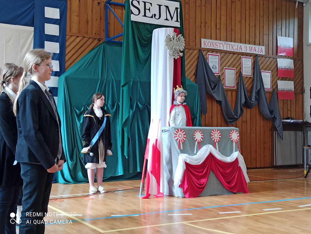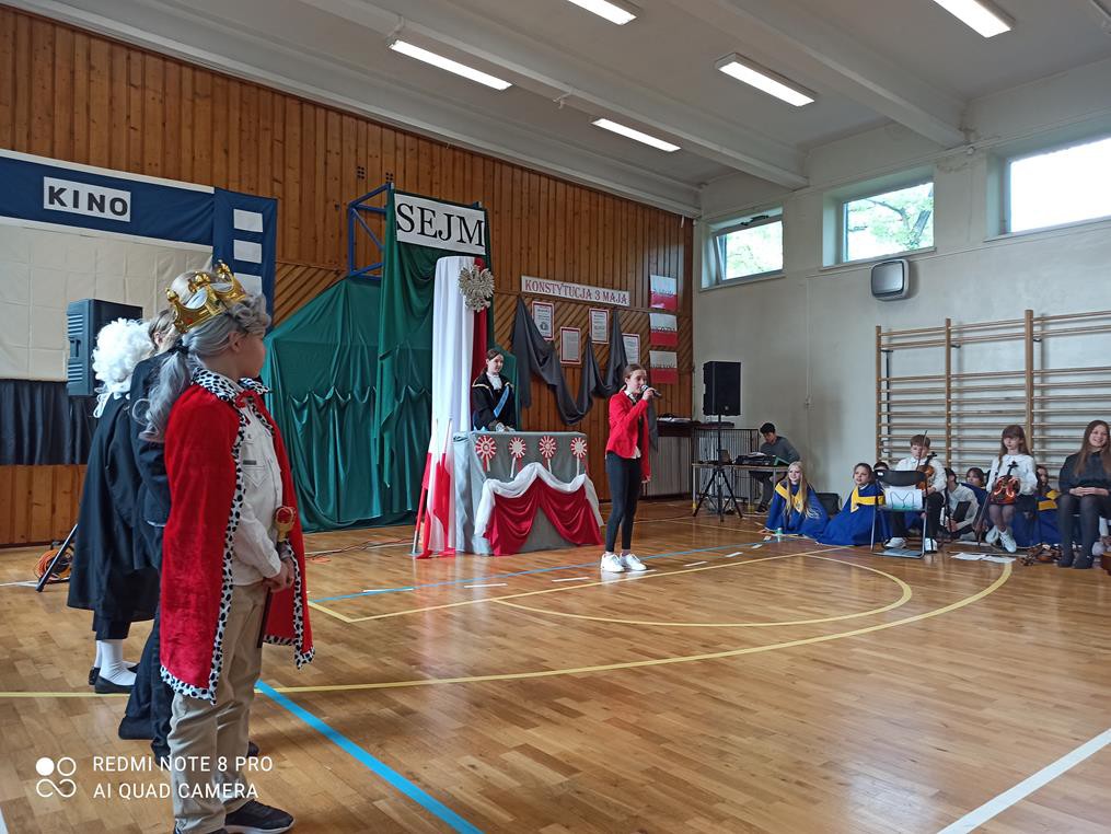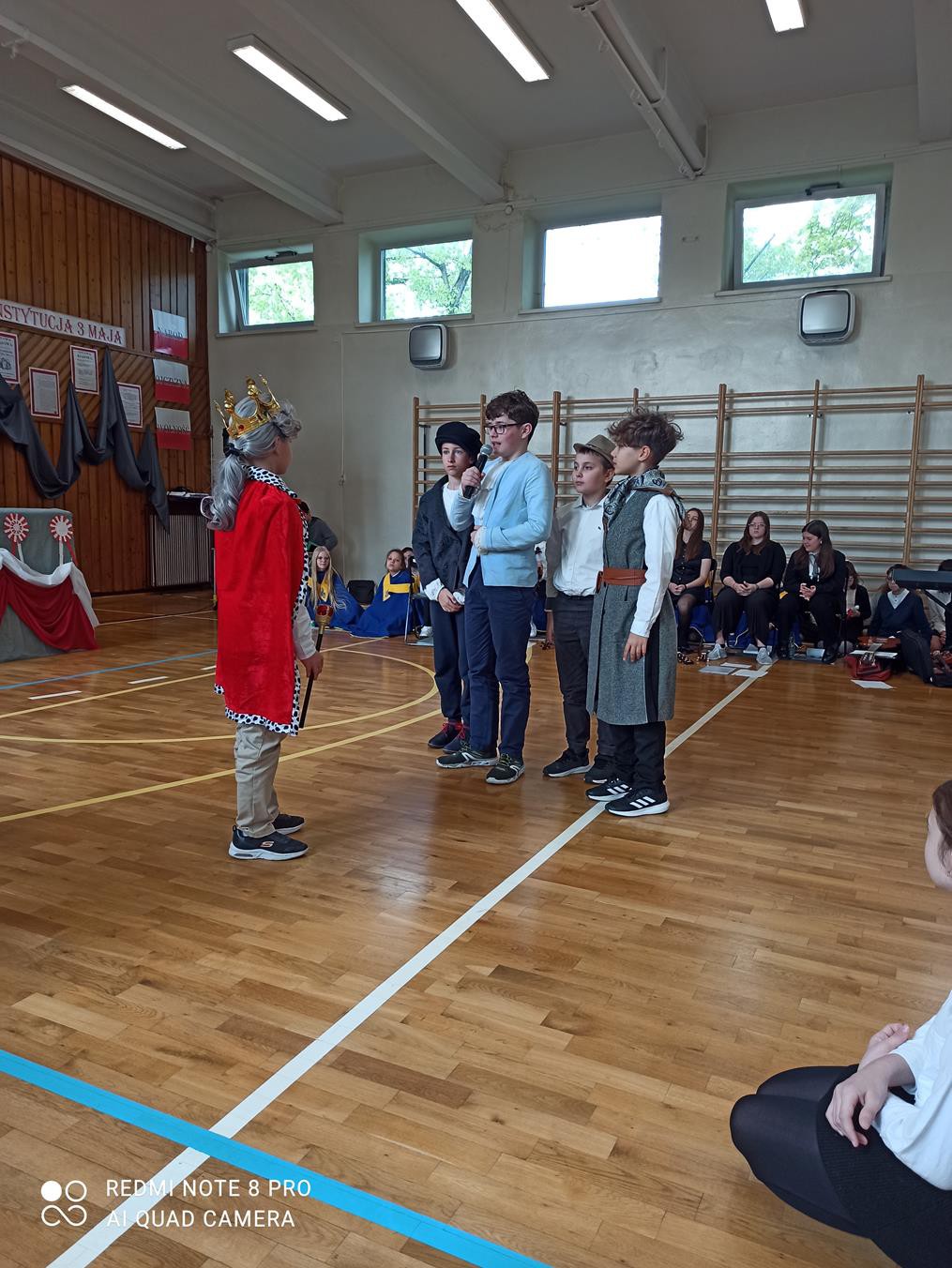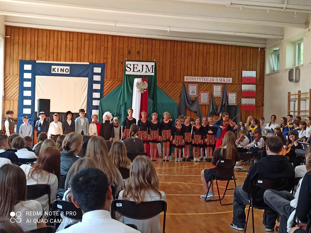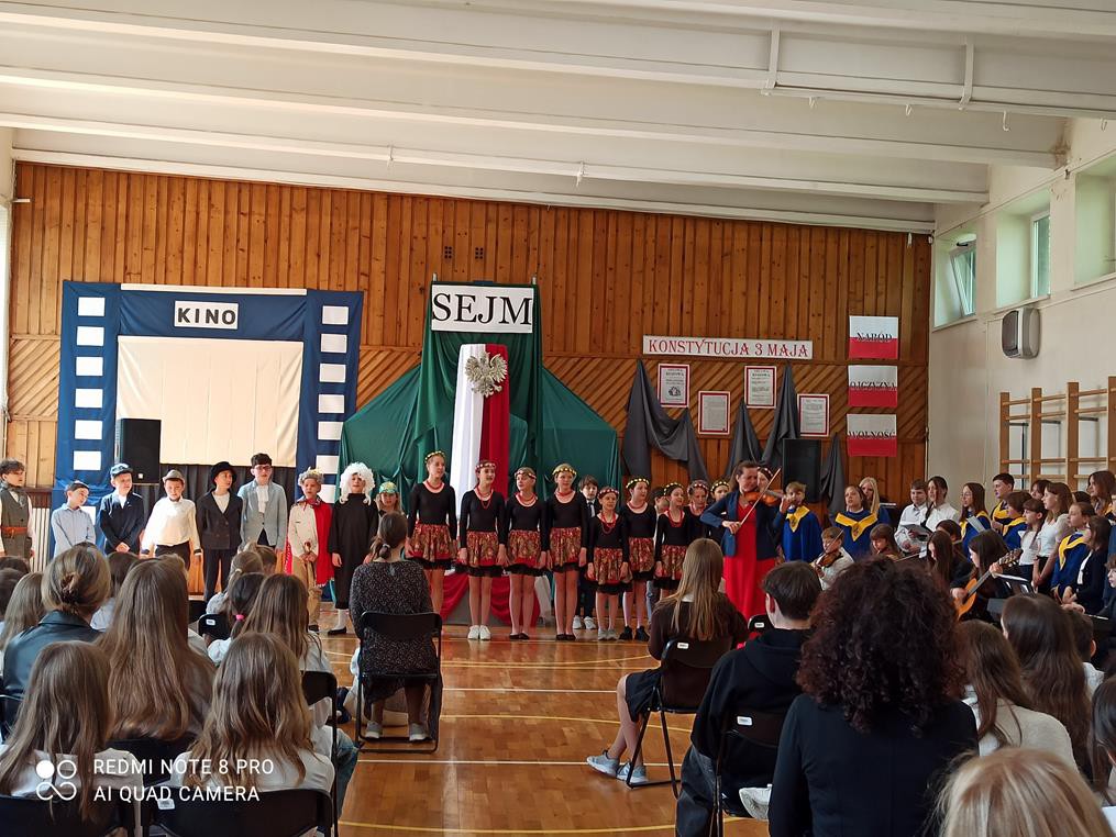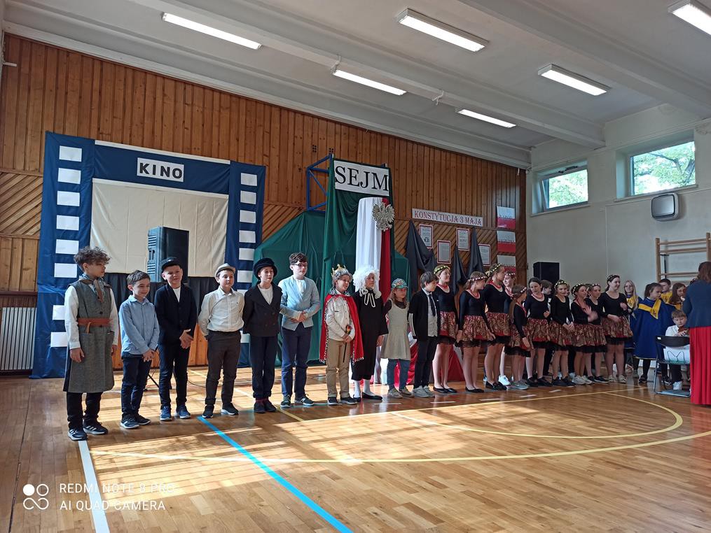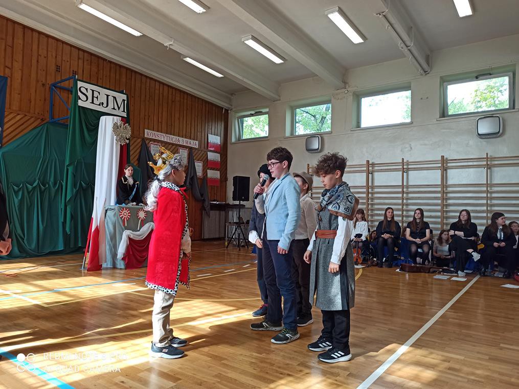 25 kwietnia obchodziliśmy w szkole rocznicę Uchwalenia Konstytucji 3 Maja. Uroczystość rozpoczęła się od wprowadzenia Sztandaru Szkoły i odśpiewania „Mazurka Dąbrowskiego”. Część artystyczną zaprezentowali uczniowie klasy 5a i 5b. Dzięki przygotowanej inscenizacji przenieśliśmy się w czasie, do roku 1791. Widzowie mogli zobaczyć i usłyszeć, nad czym radzili i jak wypowiadali się uczestnicy obrad Sejmu Czteroletniego, jakie przytaczali argumenty dla swoich racji i jak podejmowali Uchwałę. Głos zabierali Marszałek Stanisław Małachowski, Hugo Kołłątaj, Seweryn Branicki, Ignacy Potocki, Jan Dekert, Ksawery Branicki i oczywiście król Stanisław August Poniatowski. Aktorzy znakomicie przywołali emocje jakie towarzyszyły tamtym wydarzeniom. Uroczystość uświetnił występ szkolnego chóru i zespołu instrumentalnego oraz grupa taneczna.
