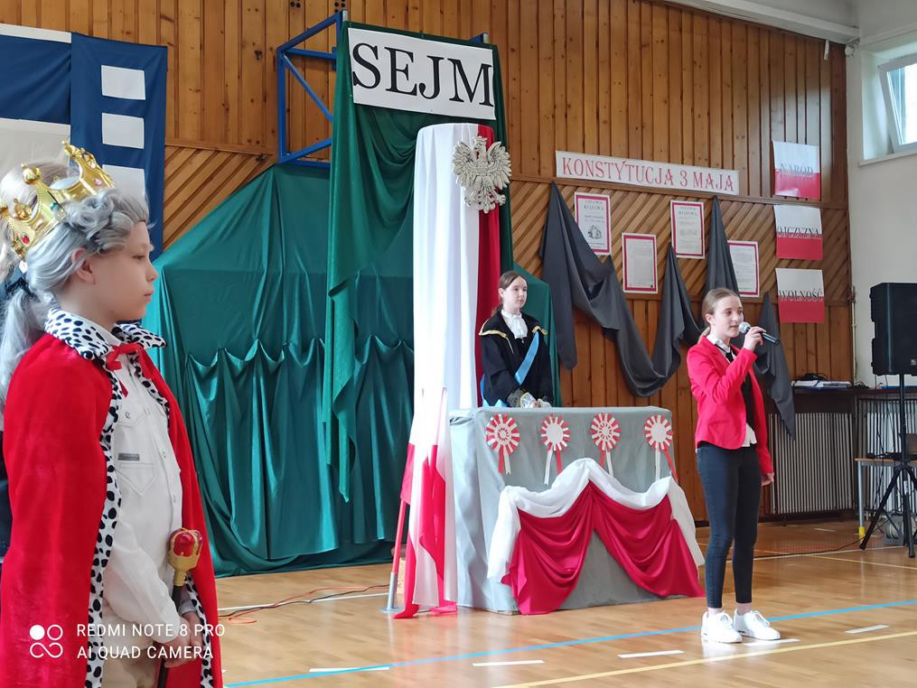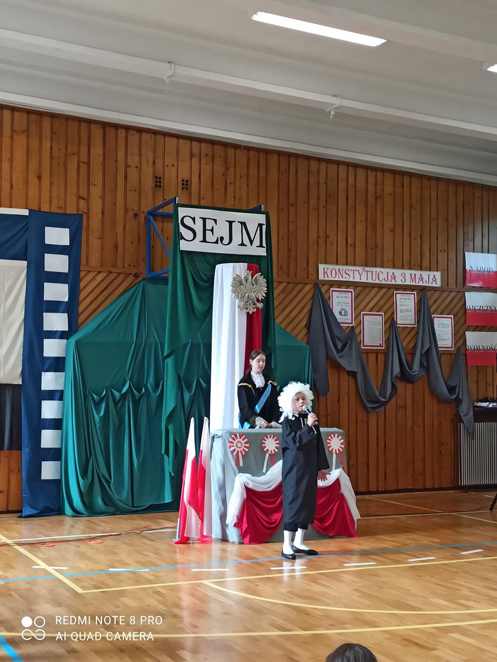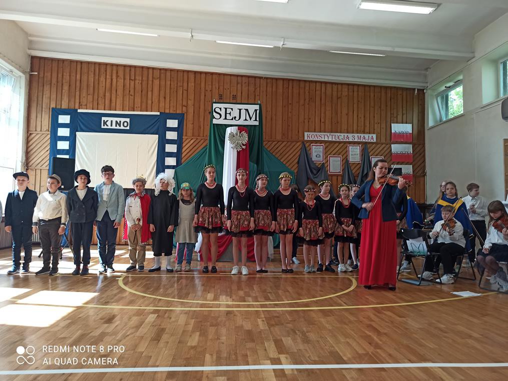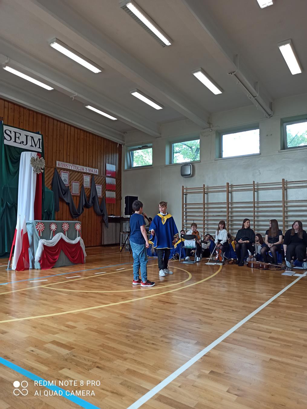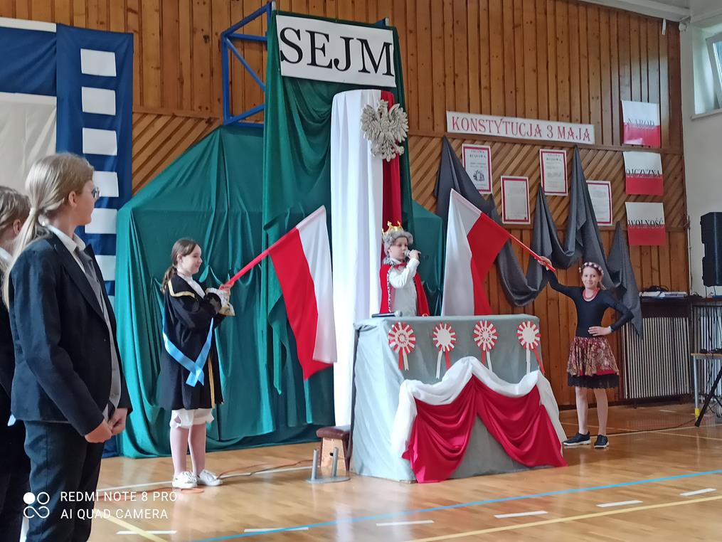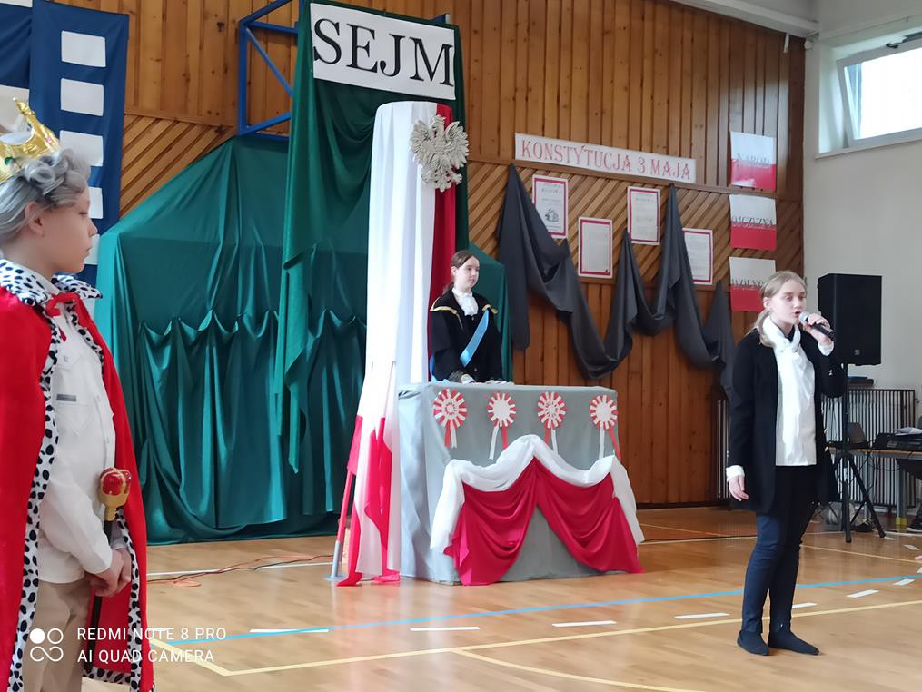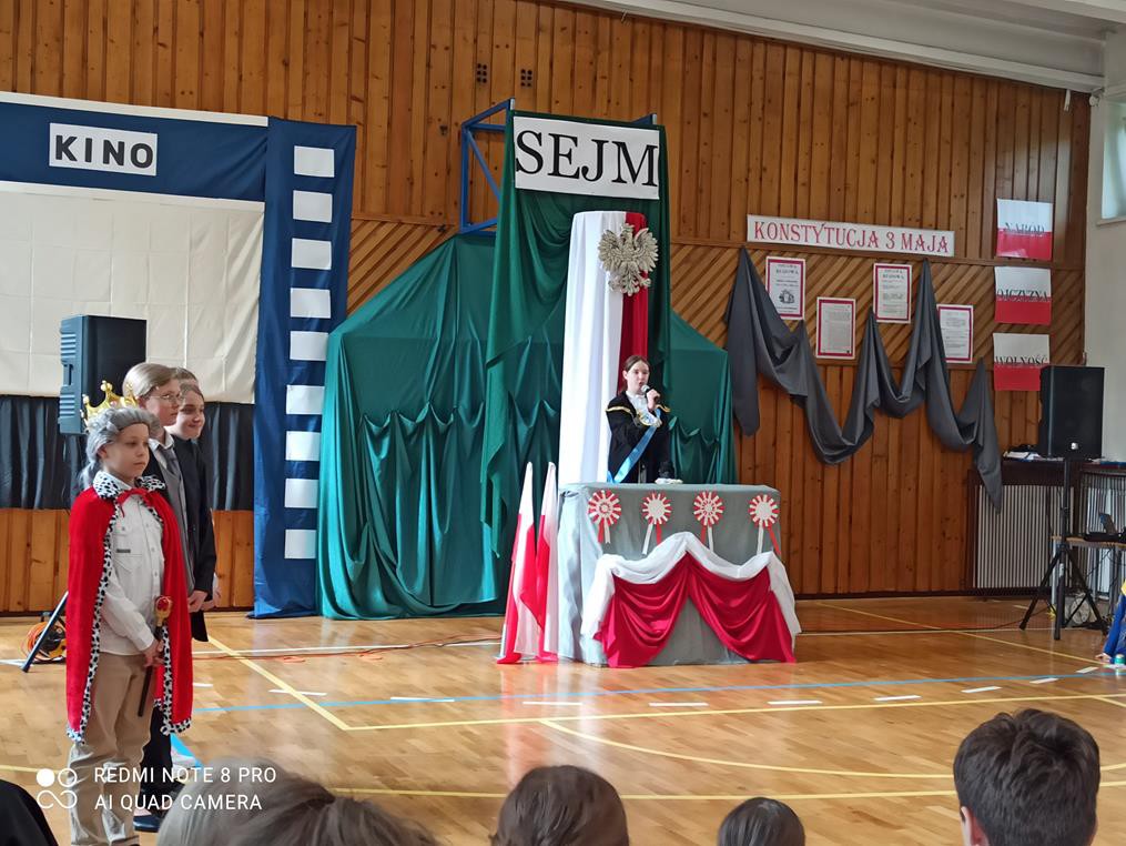 25 kwietnia obchodziliśmy w szkole rocznicę Uchwalenia Konstytucji 3 Maja. Uroczystość rozpoczęła się od wprowadzenia Sztandaru Szkoły i odśpiewania „Mazurka Dąbrowskiego”. Część artystyczną zaprezentowali uczniowie klasy 5a i 5b. Dzięki przygotowanej inscenizacji przenieśliśmy się w czasie, do roku 1791. Widzowie mogli zobaczyć i usłyszeć, nad czym radzili i jak wypowiadali się uczestnicy obrad Sejmu Czteroletniego, jakie przytaczali argumenty dla swoich racji i jak podejmowali Uchwałę. Głos zabierali Marszałek Stanisław Małachowski, Hugo Kołłątaj, Seweryn Branicki, Ignacy Potocki, Jan Dekert, Ksawery Branicki i oczywiście król Stanisław August Poniatowski. Aktorzy znakomicie przywołali emocje jakie towarzyszyły tamtym wydarzeniom. Uroczystość uświetnił występ szkolnego chóru i zespołu instrumentalnego oraz grupa taneczna.