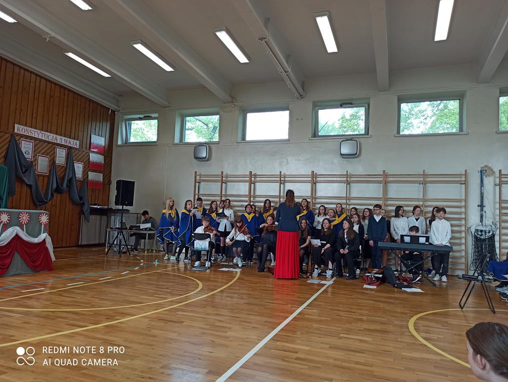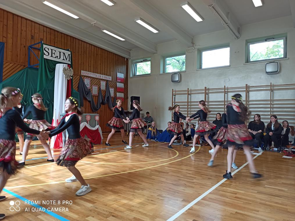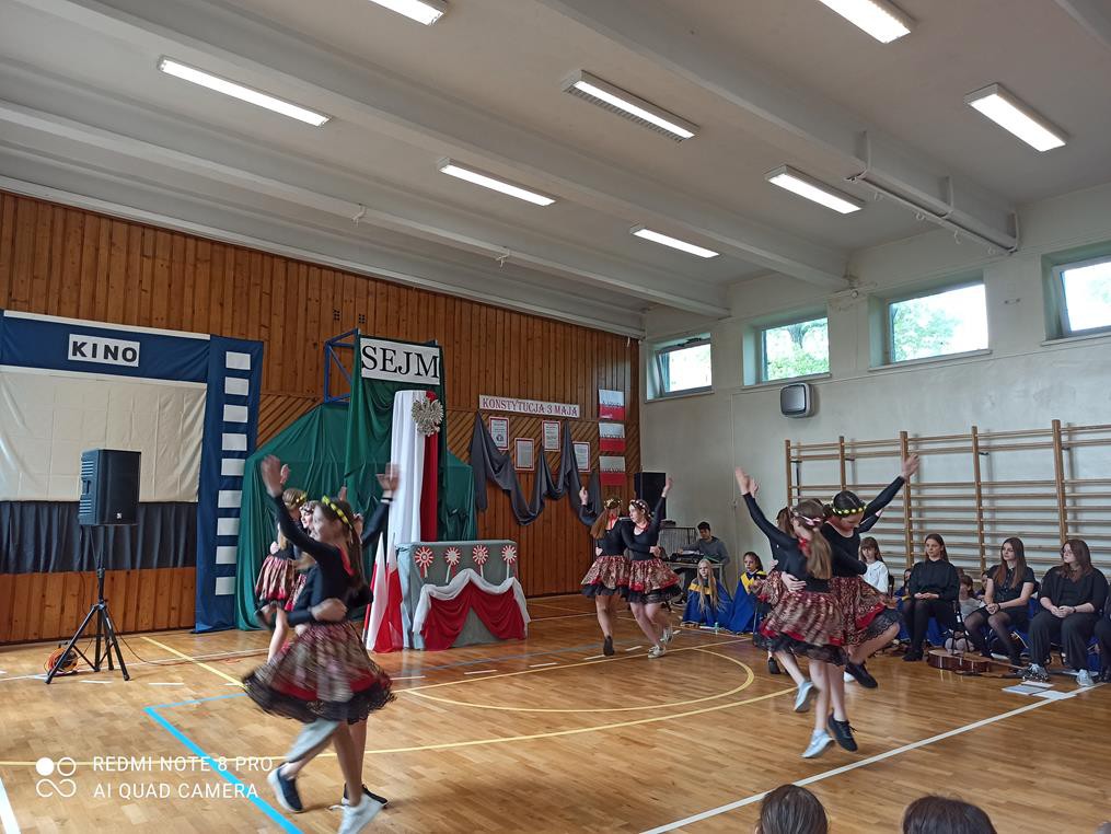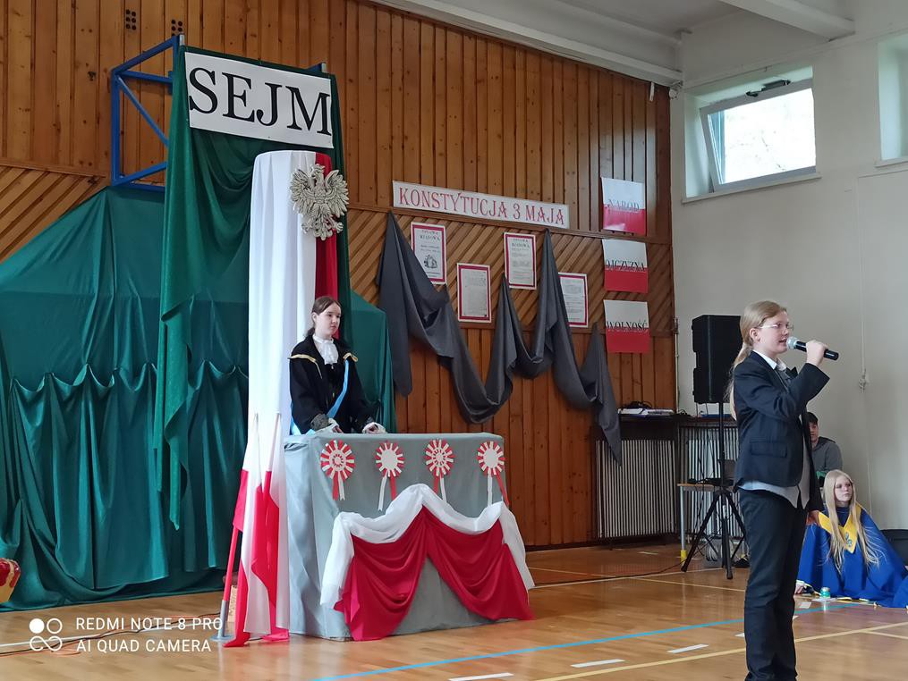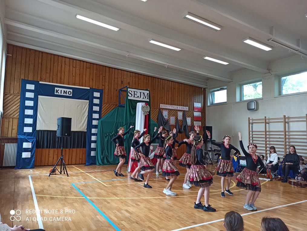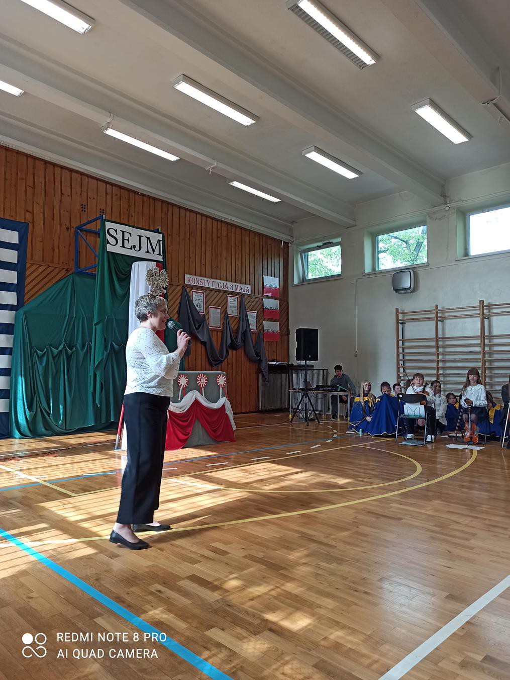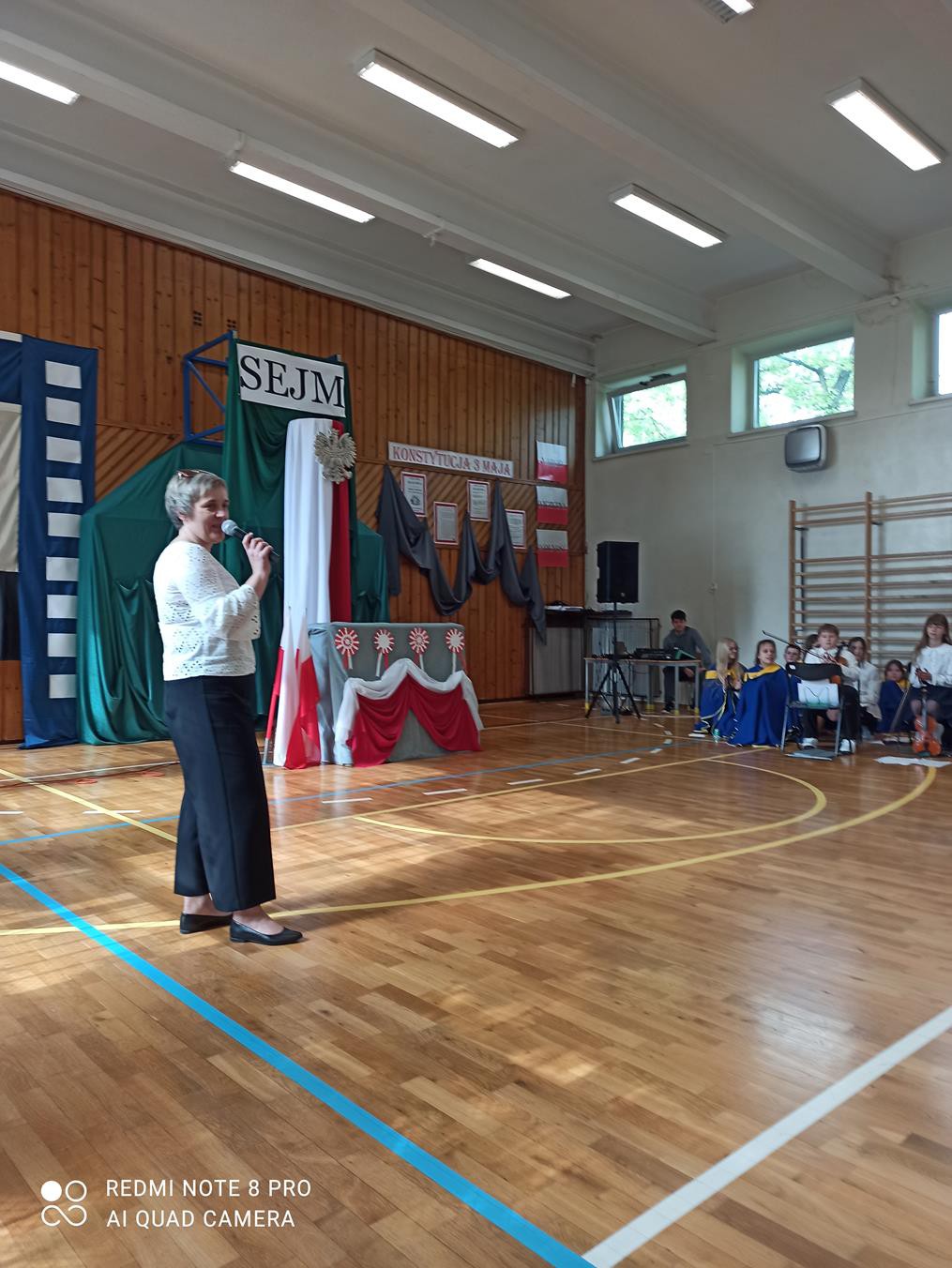 25 kwietnia obchodziliśmy w szkole rocznicę Uchwalenia Konstytucji 3 Maja. Uroczystość rozpoczęła się od wprowadzenia Sztandaru Szkoły i odśpiewania „Mazurka Dąbrowskiego”. Część artystyczną zaprezentowali uczniowie klasy 5a i 5b. Dzięki przygotowanej inscenizacji przenieśliśmy się w czasie, do roku 1791. Widzowie mogli zobaczyć i usłyszeć, nad czym radzili i jak wypowiadali się uczestnicy obrad Sejmu Czteroletniego, jakie przytaczali argumenty dla swoich racji i jak podejmowali Uchwałę. Głos zabierali Marszałek Stanisław Małachowski, Hugo Kołłątaj, Seweryn Branicki, Ignacy Potocki, Jan Dekert, Ksawery Branicki i oczywiście król Stanisław August Poniatowski. Aktorzy znakomicie przywołali emocje jakie towarzyszyły tamtym wydarzeniom. Uroczystość uświetnił występ szkolnego chóru i zespołu instrumentalnego oraz grupa taneczna.