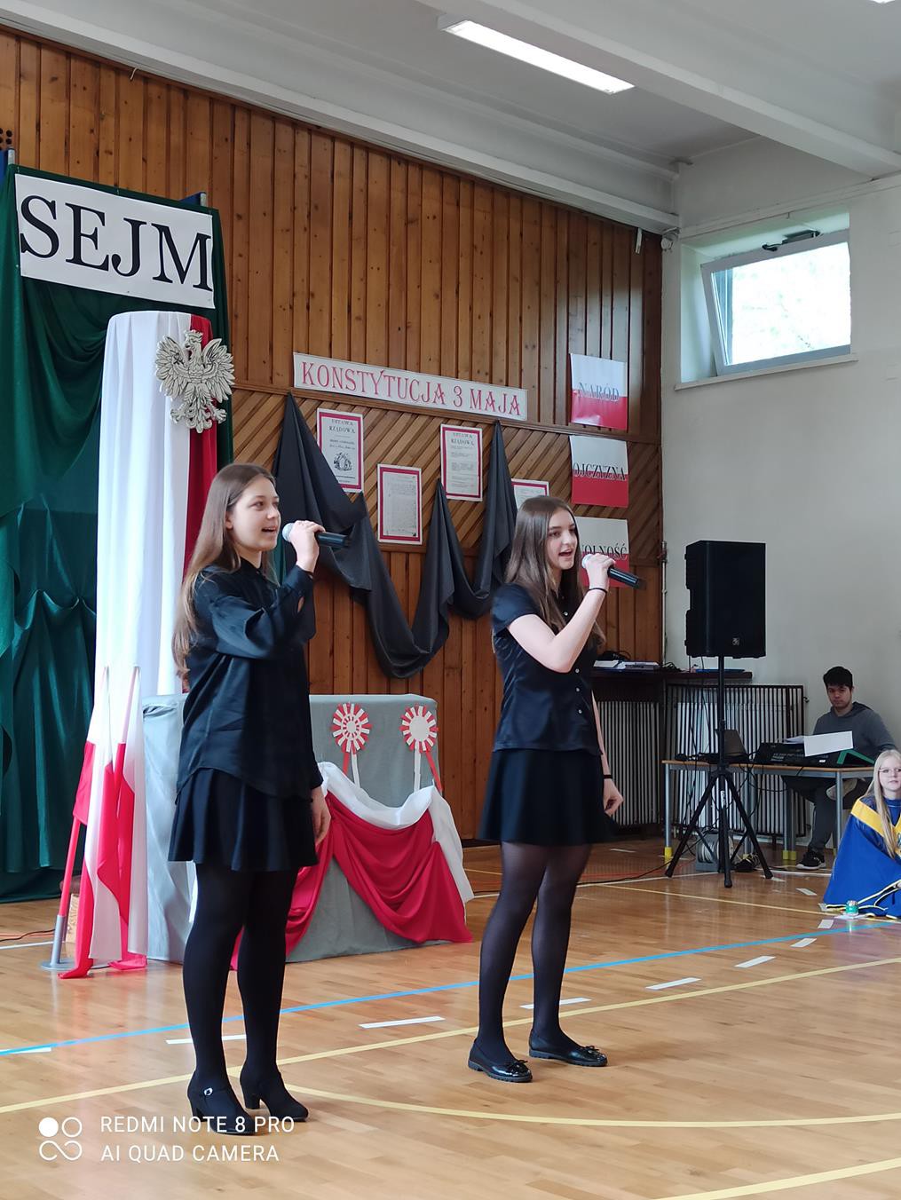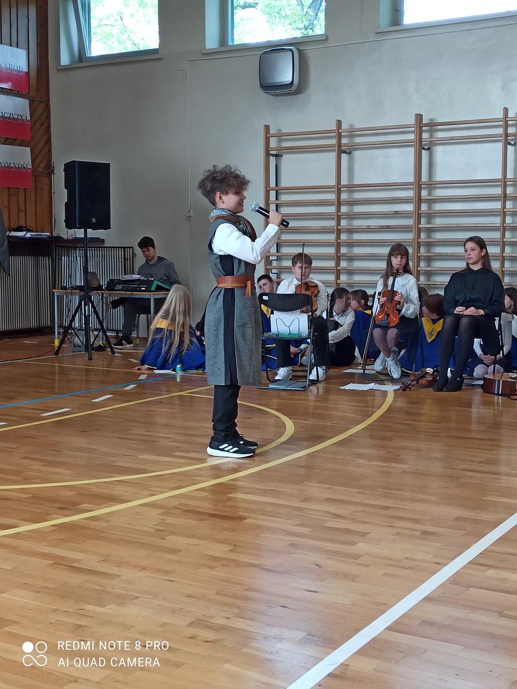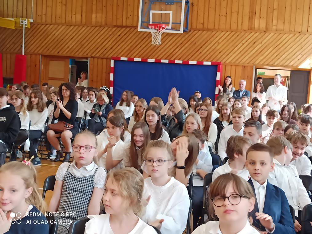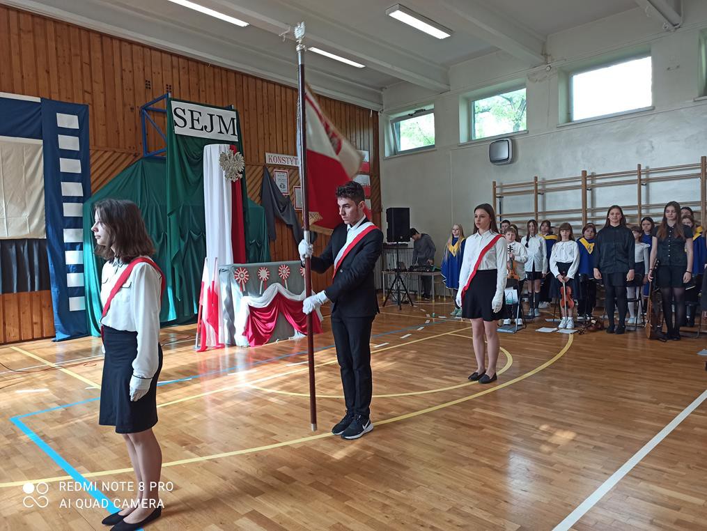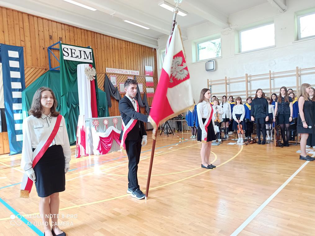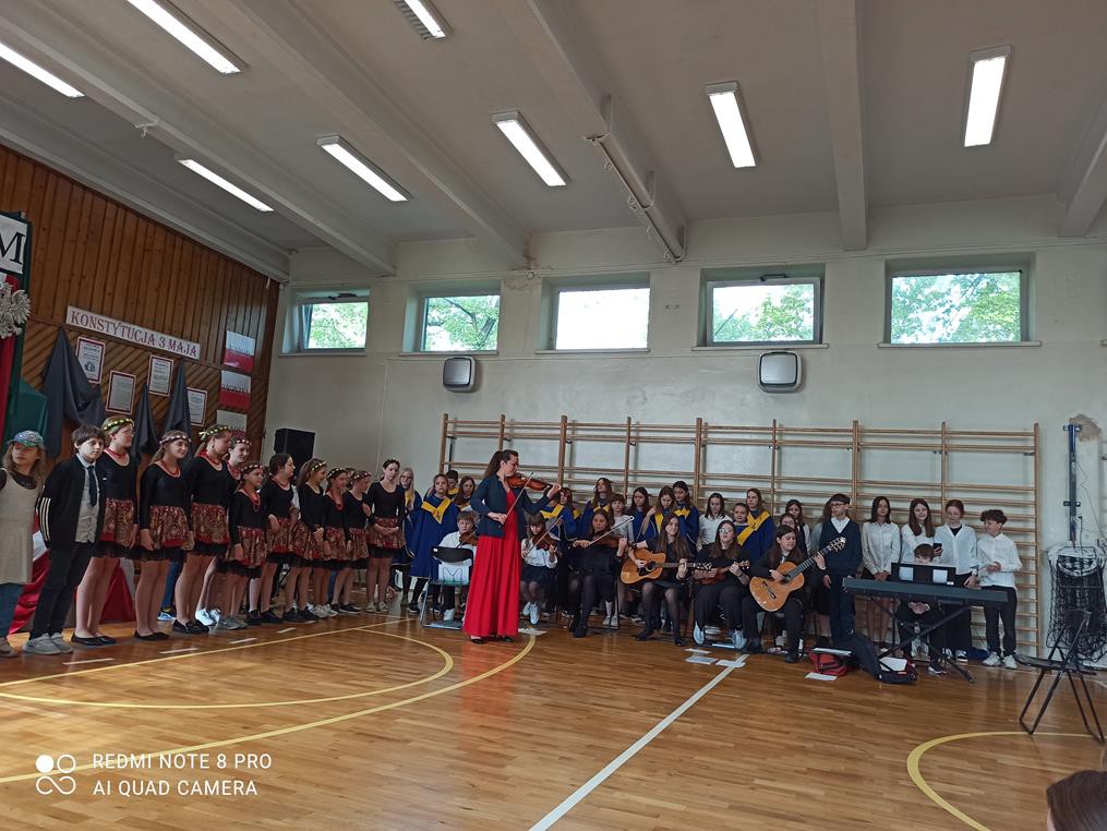 25 kwietnia obchodziliśmy w szkole rocznicę Uchwalenia Konstytucji 3 Maja. Uroczystość rozpoczęła się od wprowadzenia Sztandaru Szkoły i odśpiewania „Mazurka Dąbrowskiego”. Część artystyczną zaprezentowali uczniowie klasy 5a i 5b. Dzięki przygotowanej inscenizacji przenieśliśmy się w czasie, do roku 1791. Widzowie mogli zobaczyć i usłyszeć, nad czym radzili i jak wypowiadali się uczestnicy obrad Sejmu Czteroletniego, jakie przytaczali argumenty dla swoich racji i jak podejmowali Uchwałę. Głos zabierali Marszałek Stanisław Małachowski, Hugo Kołłątaj, Seweryn Branicki, Ignacy Potocki, Jan Dekert, Ksawery Branicki i oczywiście król Stanisław August Poniatowski. Aktorzy znakomicie przywołali emocje jakie towarzyszyły tamtym wydarzeniom. Uroczystość uświetnił występ szkolnego chóru i zespołu instrumentalnego oraz grupa taneczna.