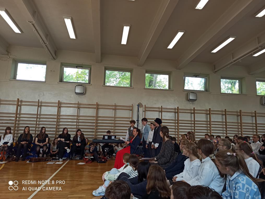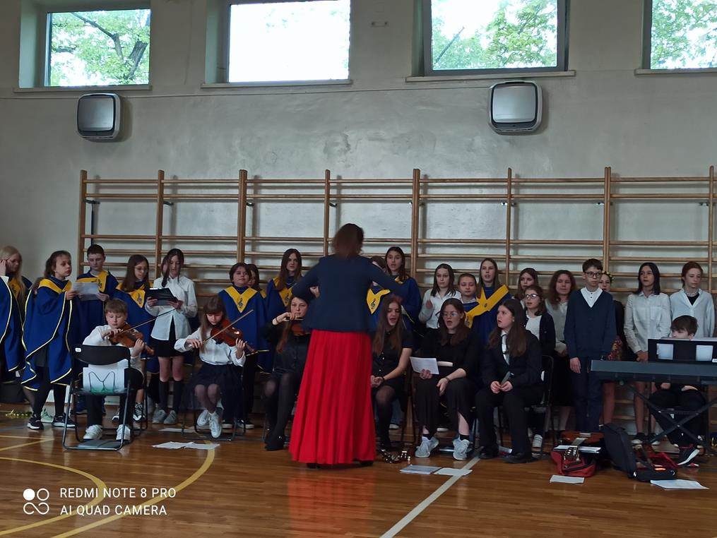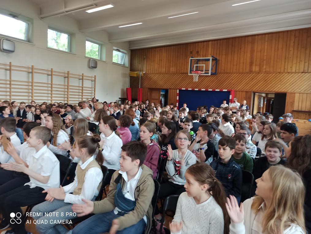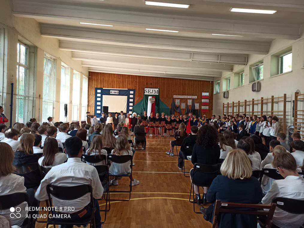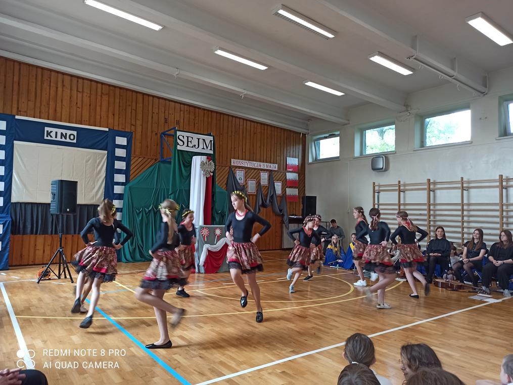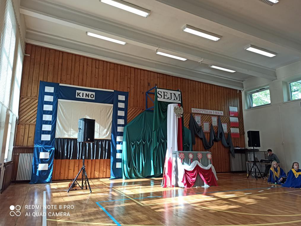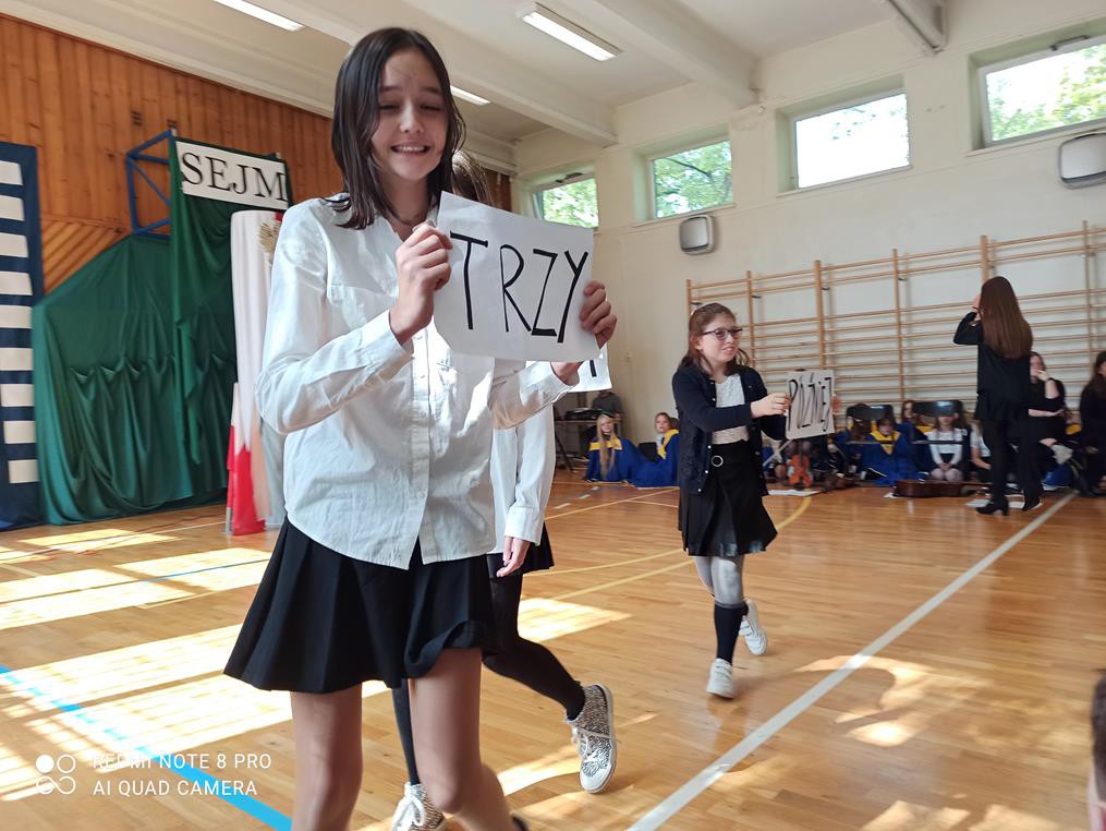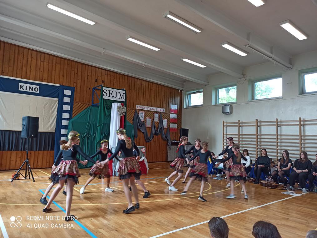 25 kwietnia obchodziliśmy w szkole rocznicę Uchwalenia Konstytucji 3 Maja. Uroczystość rozpoczęła się od wprowadzenia Sztandaru Szkoły i odśpiewania „Mazurka Dąbrowskiego”. Część artystyczną zaprezentowali uczniowie klasy 5a i 5b. Dzięki przygotowanej inscenizacji przenieśliśmy się w czasie, do roku 1791. Widzowie mogli zobaczyć i usłyszeć, nad czym radzili i jak wypowiadali się uczestnicy obrad Sejmu Czteroletniego, jakie przytaczali argumenty dla swoich racji i jak podejmowali Uchwałę. Głos zabierali Marszałek Stanisław Małachowski, Hugo Kołłątaj, Seweryn Branicki, Ignacy Potocki, Jan Dekert, Ksawery Branicki i oczywiście król Stanisław August Poniatowski. Aktorzy znakomicie przywołali emocje jakie towarzyszyły tamtym wydarzeniom. Uroczystość uświetnił występ szkolnego chóru i zespołu instrumentalnego oraz grupa taneczna.