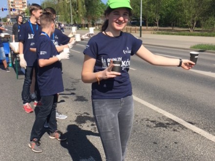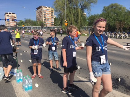 5-10 osobowe grupy pracowały przy około 17 stanowiskach, wcześniej przez siebie przygotowanych, na których ustawione były kubeczki z wodą. Mieliśmy okazję poznać wolontariuszy oraz opiekunów z ZS Mechanicznych oraz z II LO w Krakowie. Wolontariusze nie tylko pomagali zawodnikom ugasić pragnienie, ale również wspierali się nawzajem oraz służyli dopingiem sobie i zawodnikom, wykazali się ogromną umiejętnością współpracy w grupie z podziałem na zadania, kreatywnością i pomysłowością oraz zaangażowaniem. W atmosferze życzliwości udało się pomimo upału oraz szybkiego tempa sprostać zadaniu. Dziękujemy rodzicom za pomoc i zaangażowanie w akcję.
