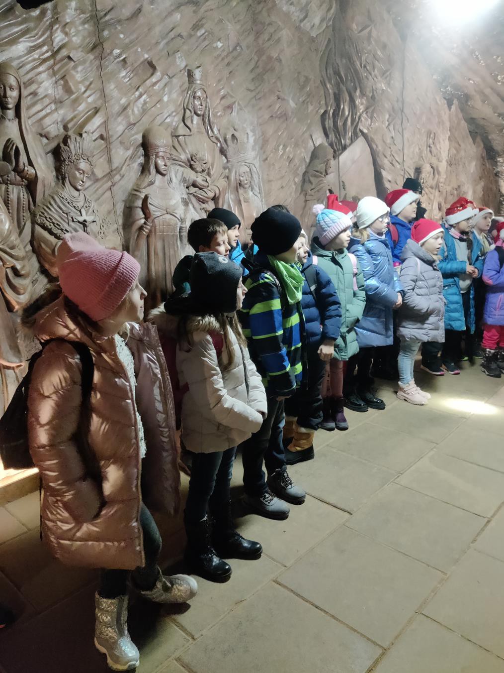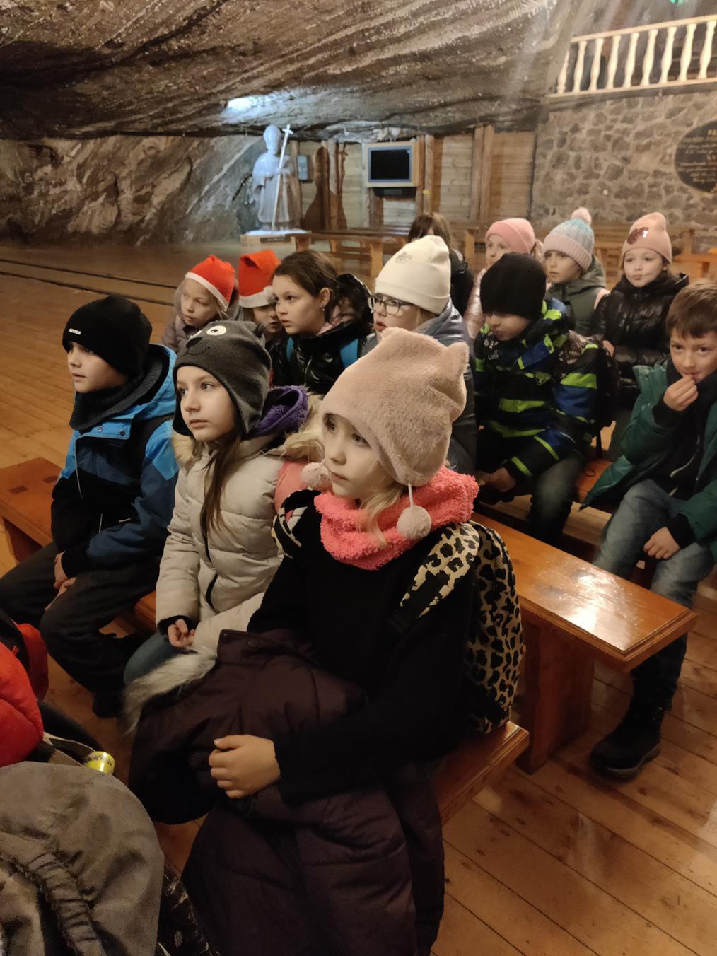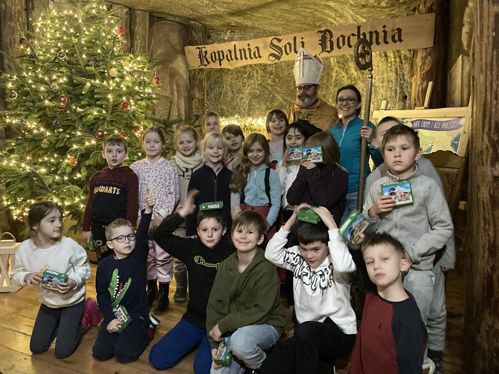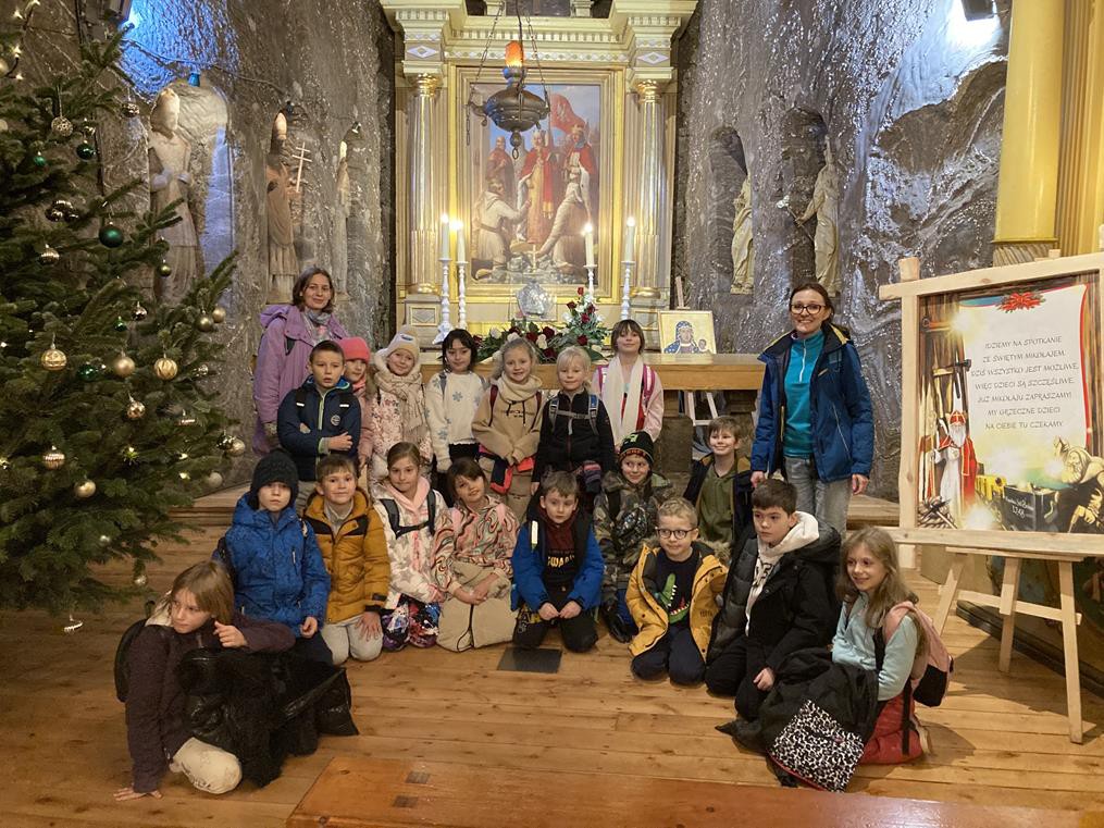 W dniu 11 grudnia klasy 2a, 2b, 2c oraz 3b pojechały na wycieczkę do najstarszej w Polsce Kopalni Soli w Bochni. Uczniowie odbyli wędrówkę w czasoprzestrzeni . Jadąc kolejką i zwiedzając trasę multimedialną mieli możliwość przeniesienia się w czasie do XII wieku oraz poznania tajników życia i pracy w kopalni soli. Podczas zwiedzania uczniowie rozwiązywali zagadki, które miały zaprowadzić ich do zaginionego worka św. Mikołaja. Misja zakończyła się sukcesem i dzieci mogły zwrócić Mikołajowi odnaleziony worek. Spotkanie z Mikołajem dostarczyło dzieciom wielu emocji. Poznały historię biskupa z Mirry i zostały obdarowane upominkami. Wycieczka zakończyła się radosnymi zabawami w sportowej komnacie kopalni.