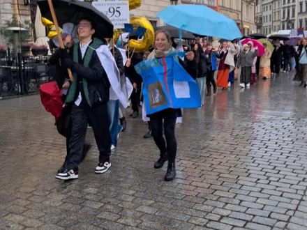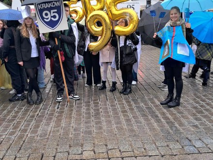 Przedstawiciele Samorządu Uczniowskiego wraz z opiekunem dumnie reprezentowali naszą szkołę. W tym roku stroje zostały przygotowane według pomysłu uczennicy klasy 8c Anny Kulakivskiej. Peleryny- zbroje i kapelusze powstały z arkuszy papieru z wydrukowanymi tekstami wierszy naszego patrona, Władysława Broniewskiego. Elementem stroju Sary Smoliński z klasy 8b -była otwarta księga ze zdjęciem poety i wierszem „Bagnet na broń”. Wszystkie stroje zostały wykonane własnoręcznie przez uczniów. Oprócz tego, nasi reprezentanci tradycyjnie nieśli transparenty z nazwą i logiem naszej szkoły, a całości dopełniały złote balony, które tworzyły napis SP95.
