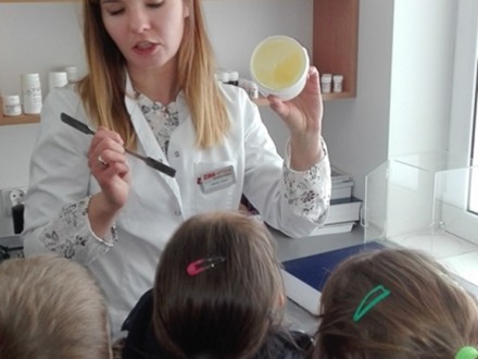21 marca klasy I b i II c odwiedziły pobliską aptekę. W trakcie spotkania dzieci dowiedziały się, kim jest farmaceuta. Przekonały się, że praca w aptece wymaga bardzo dużej wiedzy, odpowiedzialności, staranności i cierpliwości. Zobaczyły jak wygląda zaplecze apteki, jak przygotowuje się maści. Dowiedziały się, że leki są bardzo potrzebne, ale, niewłaściwie stosowane mogą być niebezpieczne. O ich zażywaniu i dawkowaniu decyduje lekarz i nigdy dzieciom nie wolno zażywać ich samodzielnie, a podstawą naszego dobrego samopoczucia jest zdrowe odżywianie i aktywność ruchowa. Wielką radość sprawiła niespodzianka: baloniki, długopisy i skakanki, które zostały wypróbowane przez wszystkich zaraz po powrocie do szkoły. Dziękujemy paniom farmaceutkom za gościnę i bardzo pouczające spotkanie.